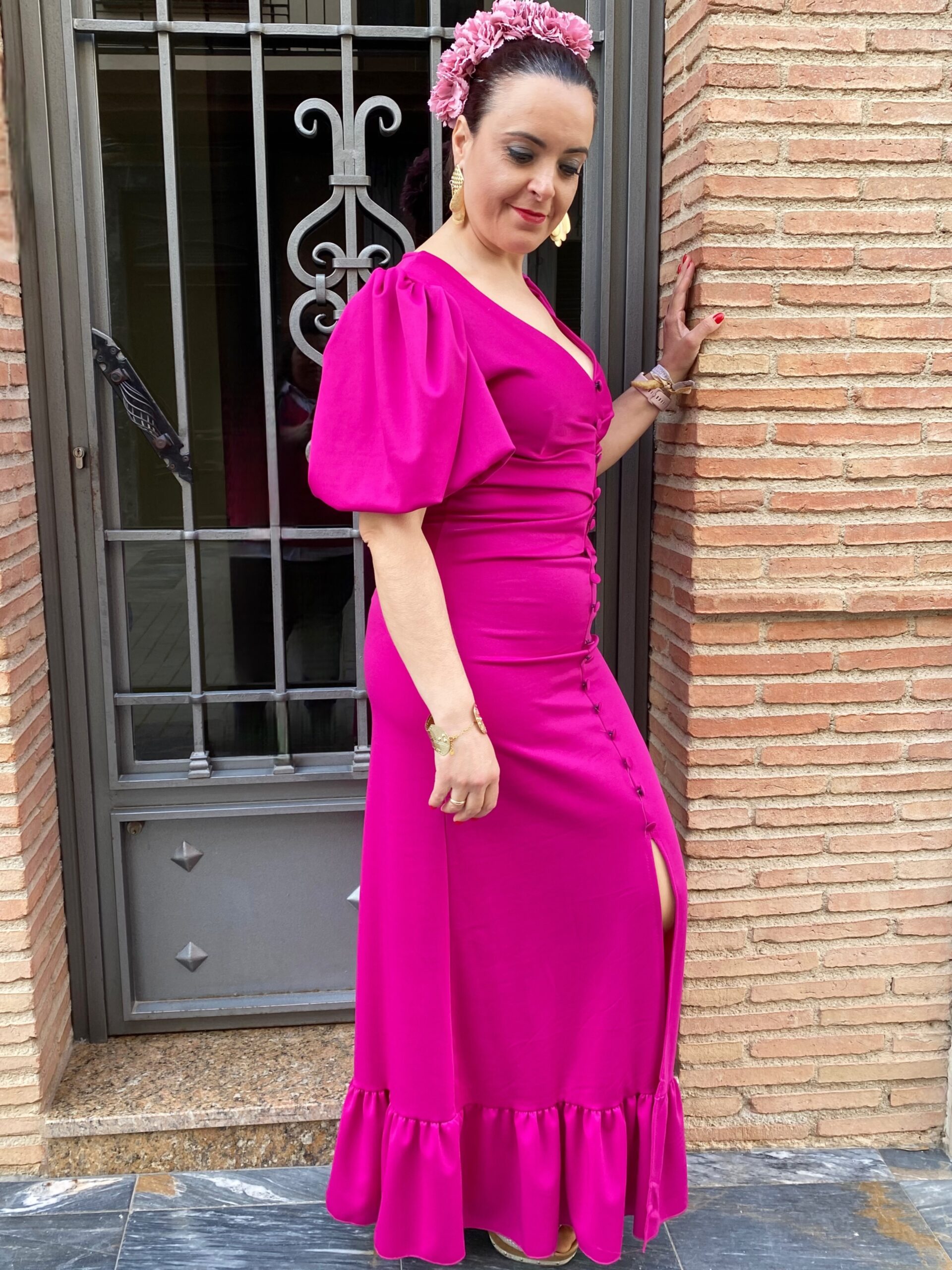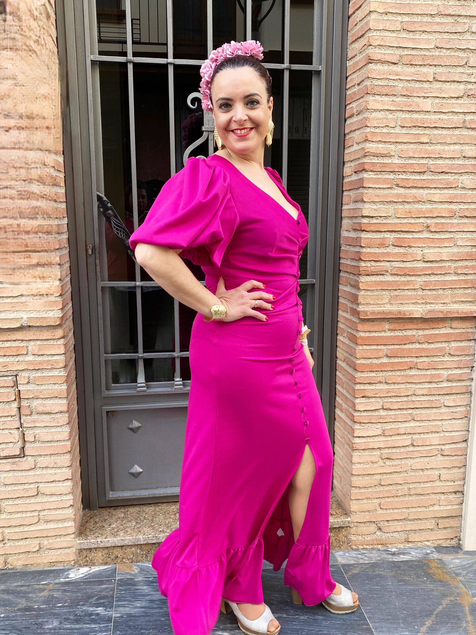 Bata en crepe elástico, con mangas abullonadas preciosas, abertura delantera y botones forrados de la misma tela.