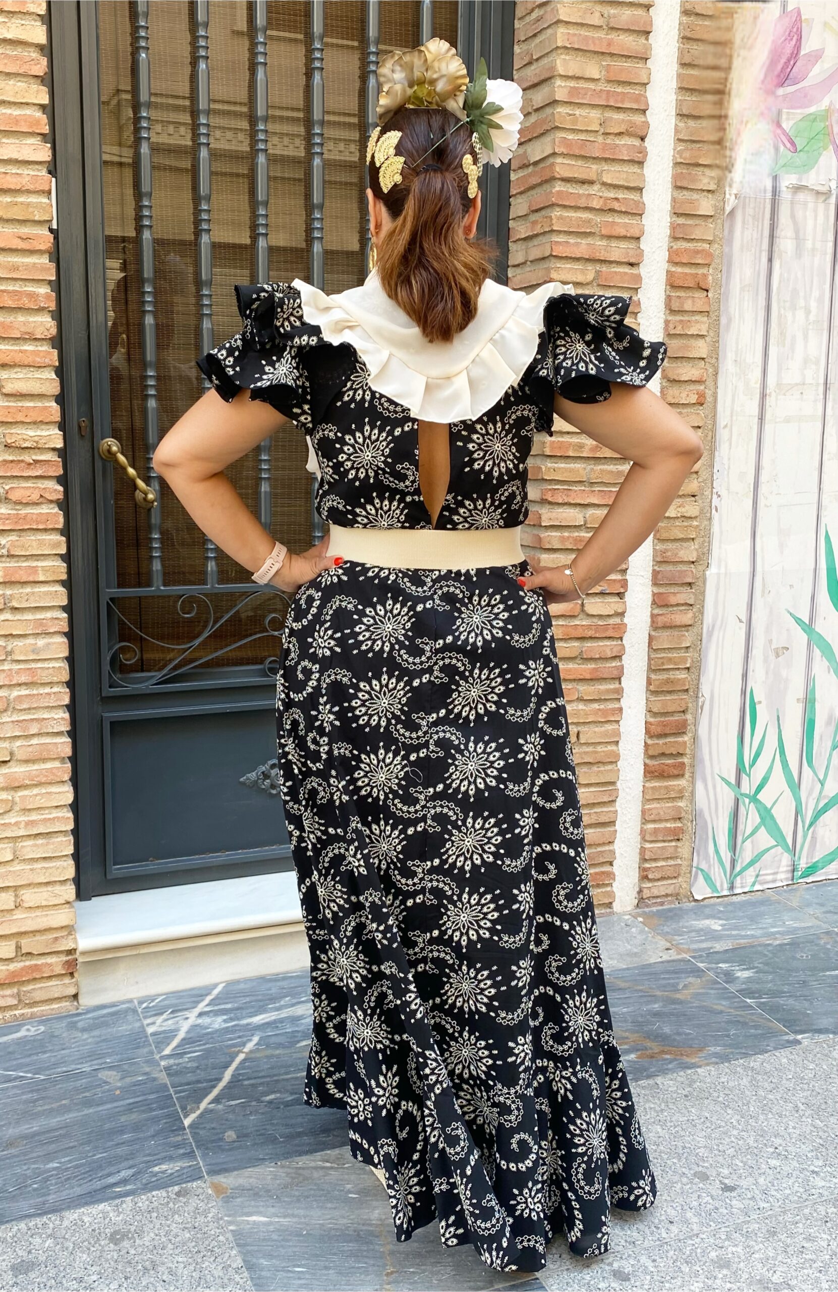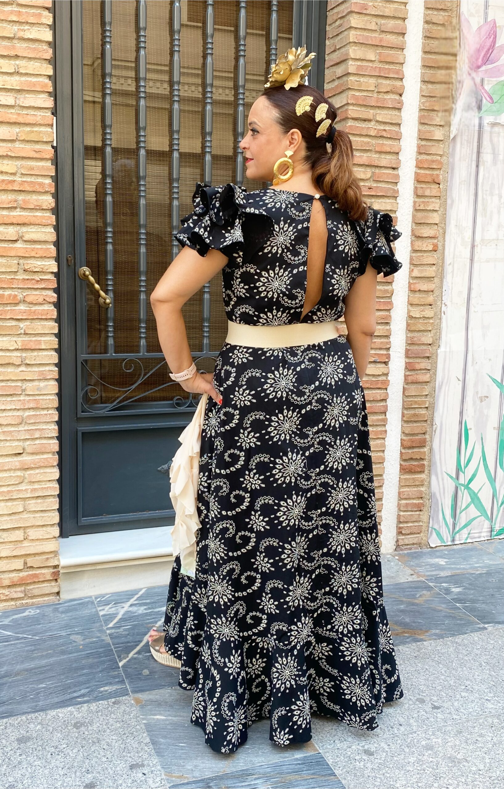 Bata Camino negra y beige, con volantes en los hombros, corte cintura, vuelo, volantón abajo y abertura en espalda.