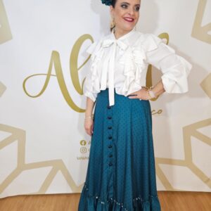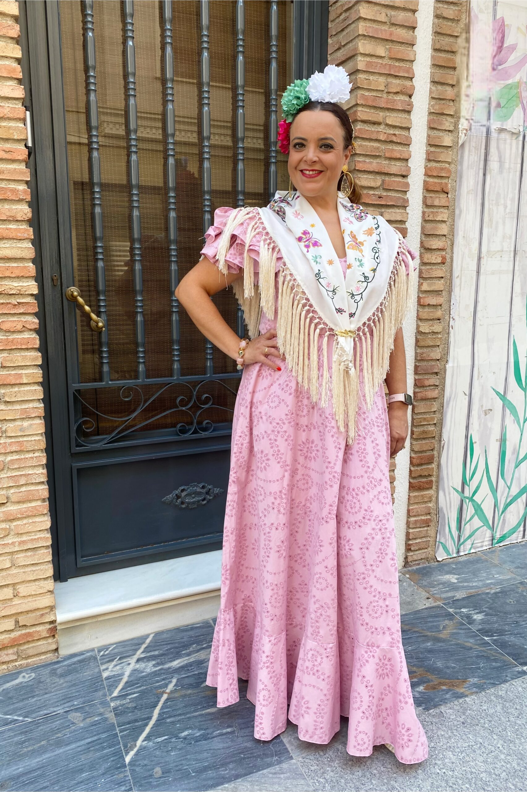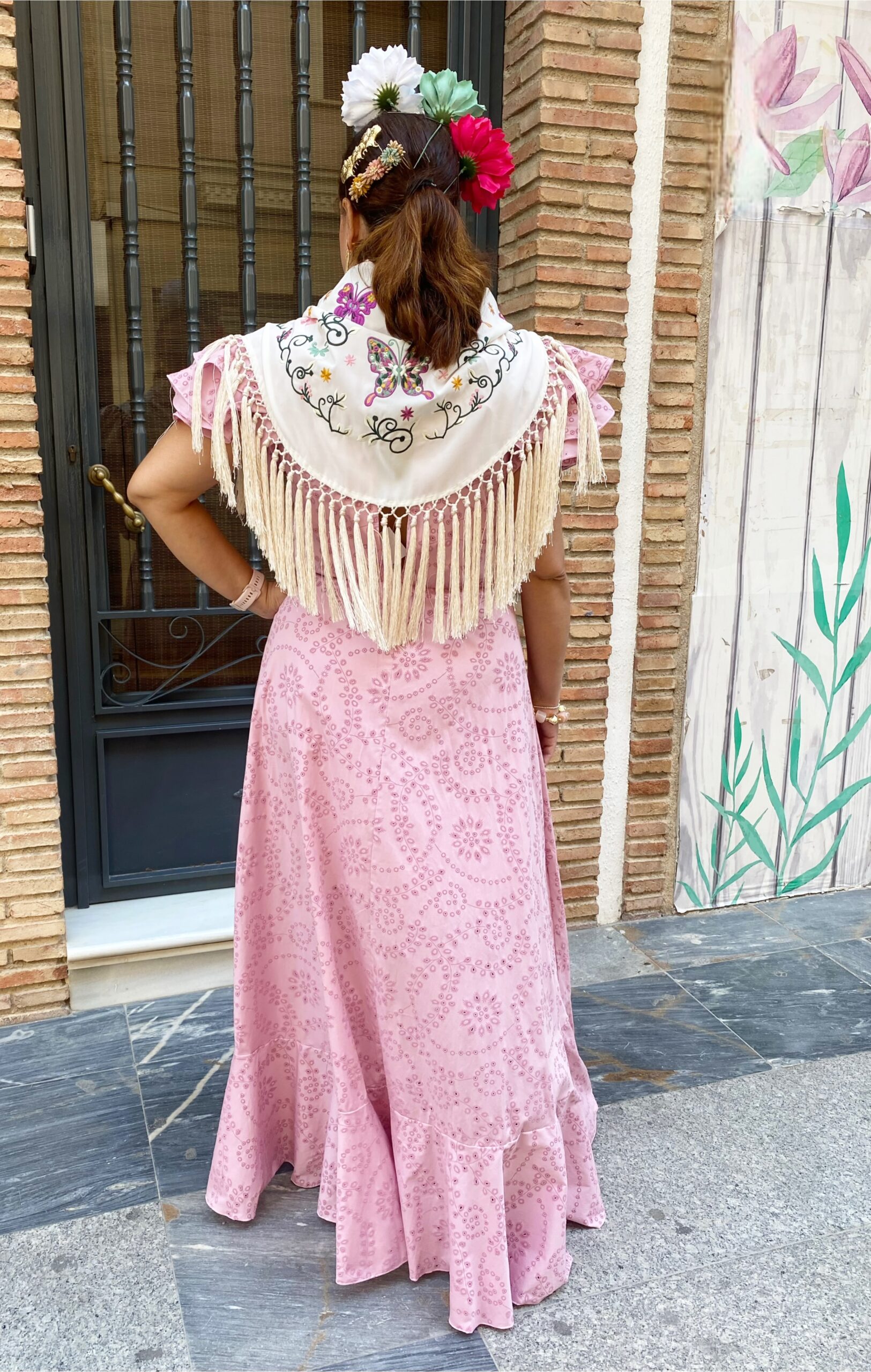 Bata Camino perforada rosa, con volantes en los hombros, corte cintura, vuelo, volantón abajo y abertura en espalda.