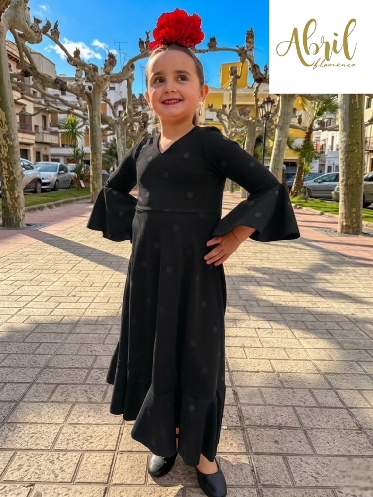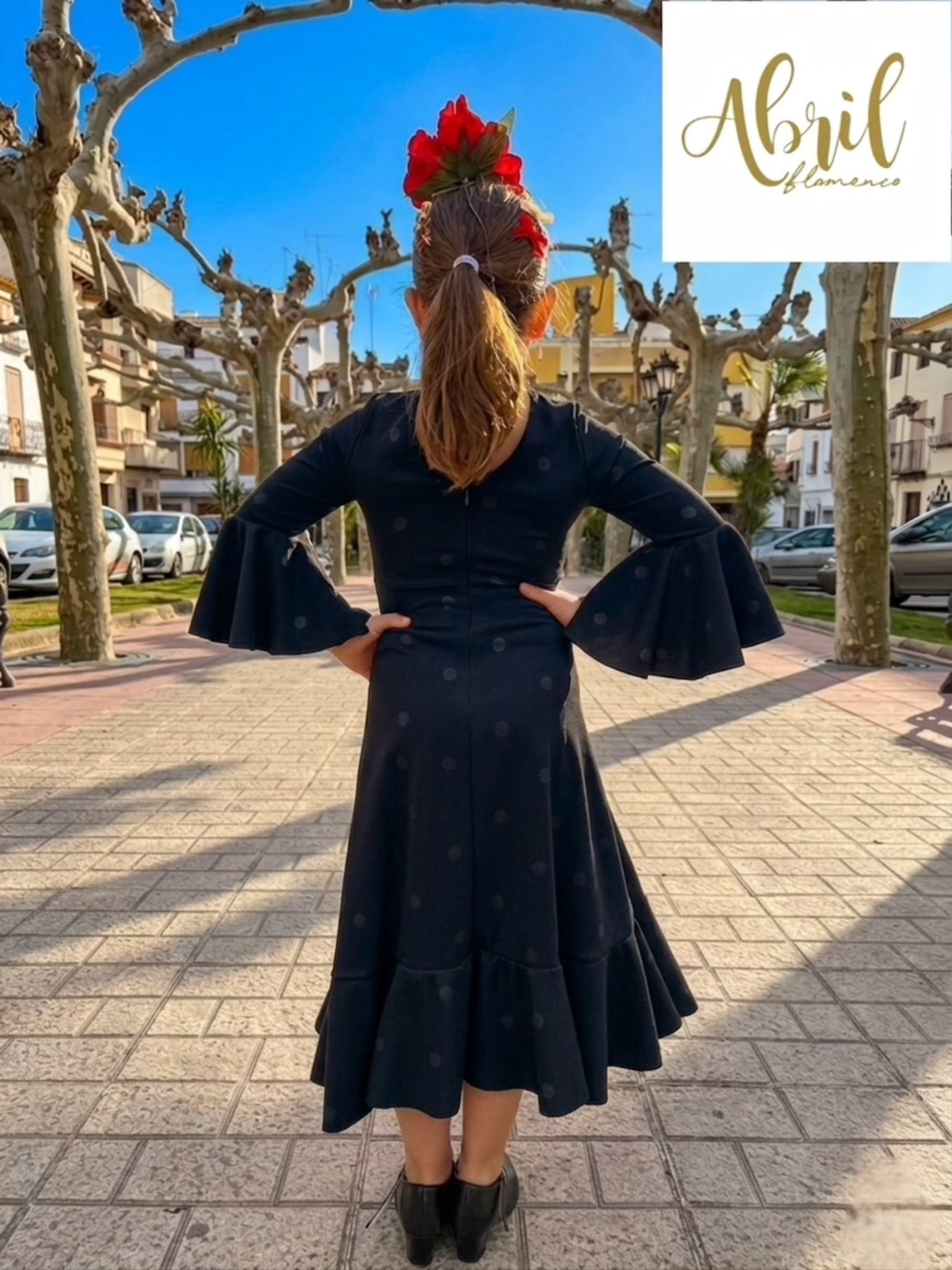 Bata negra con lunares al tono, manga larga con doble volante, corte a la cintura, volantón abajo y escote en pico en espalda y pecho.