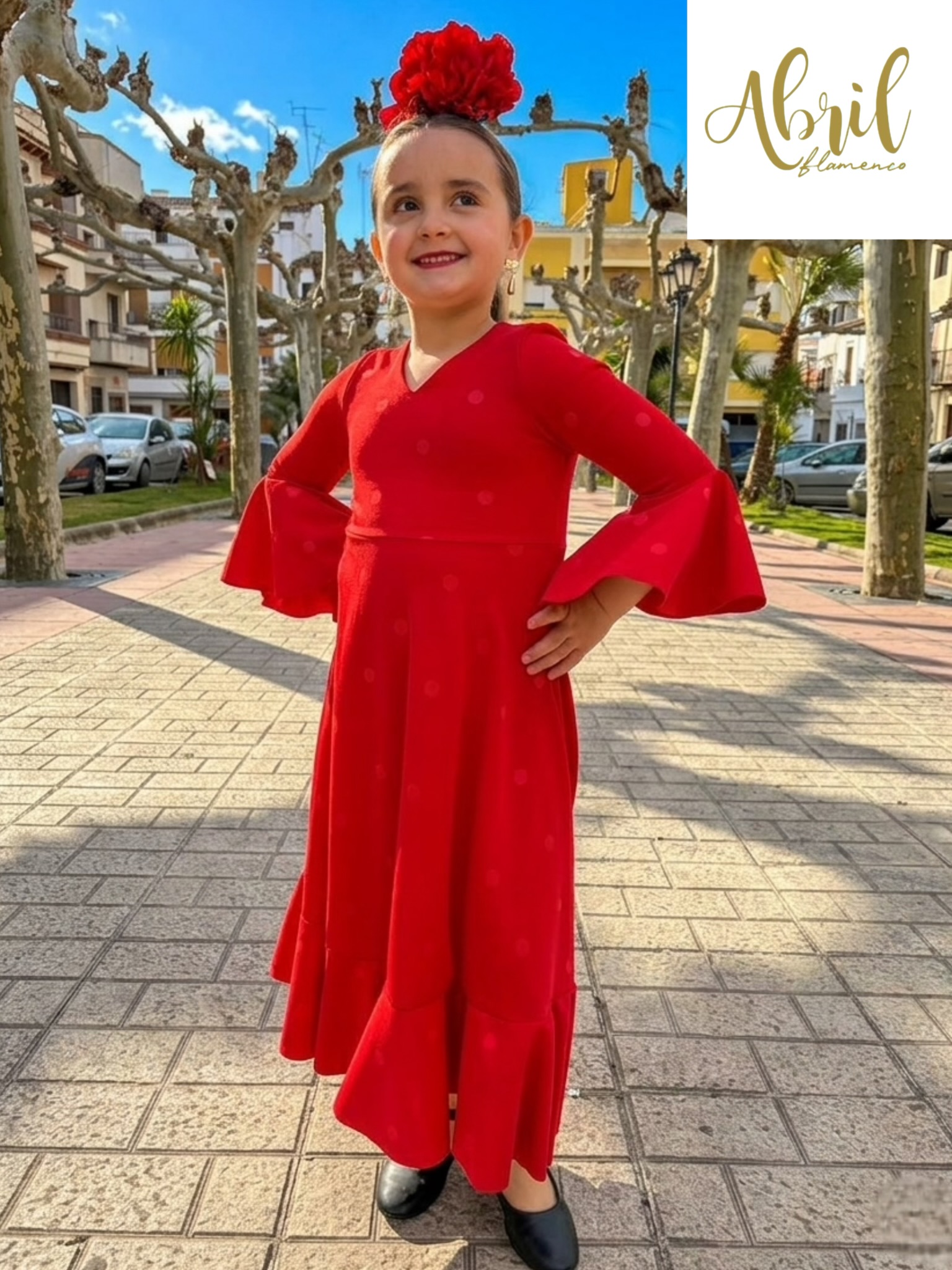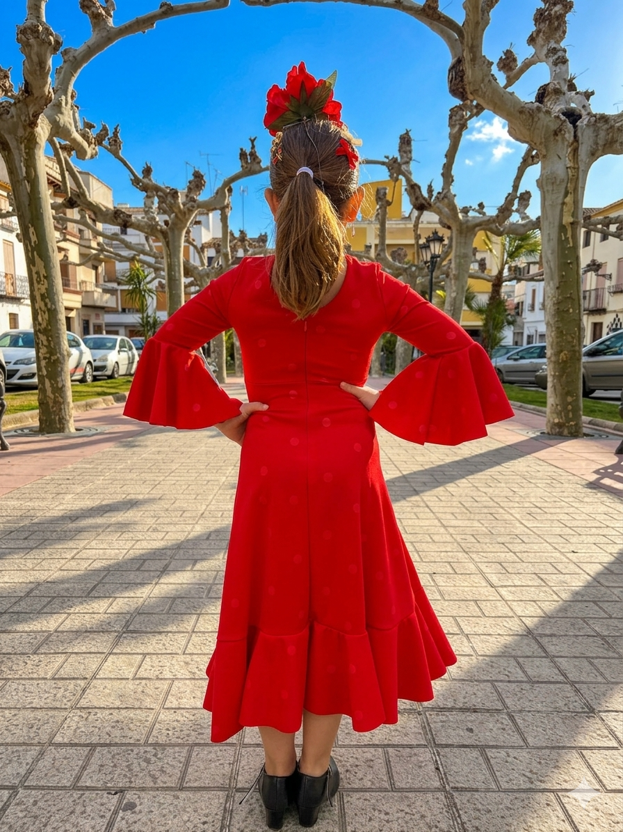 Bata roja con lunares al tono, manga larga con doble volante, corte a la cintura, volantón abajo y escote en pico en espalda y pecho.