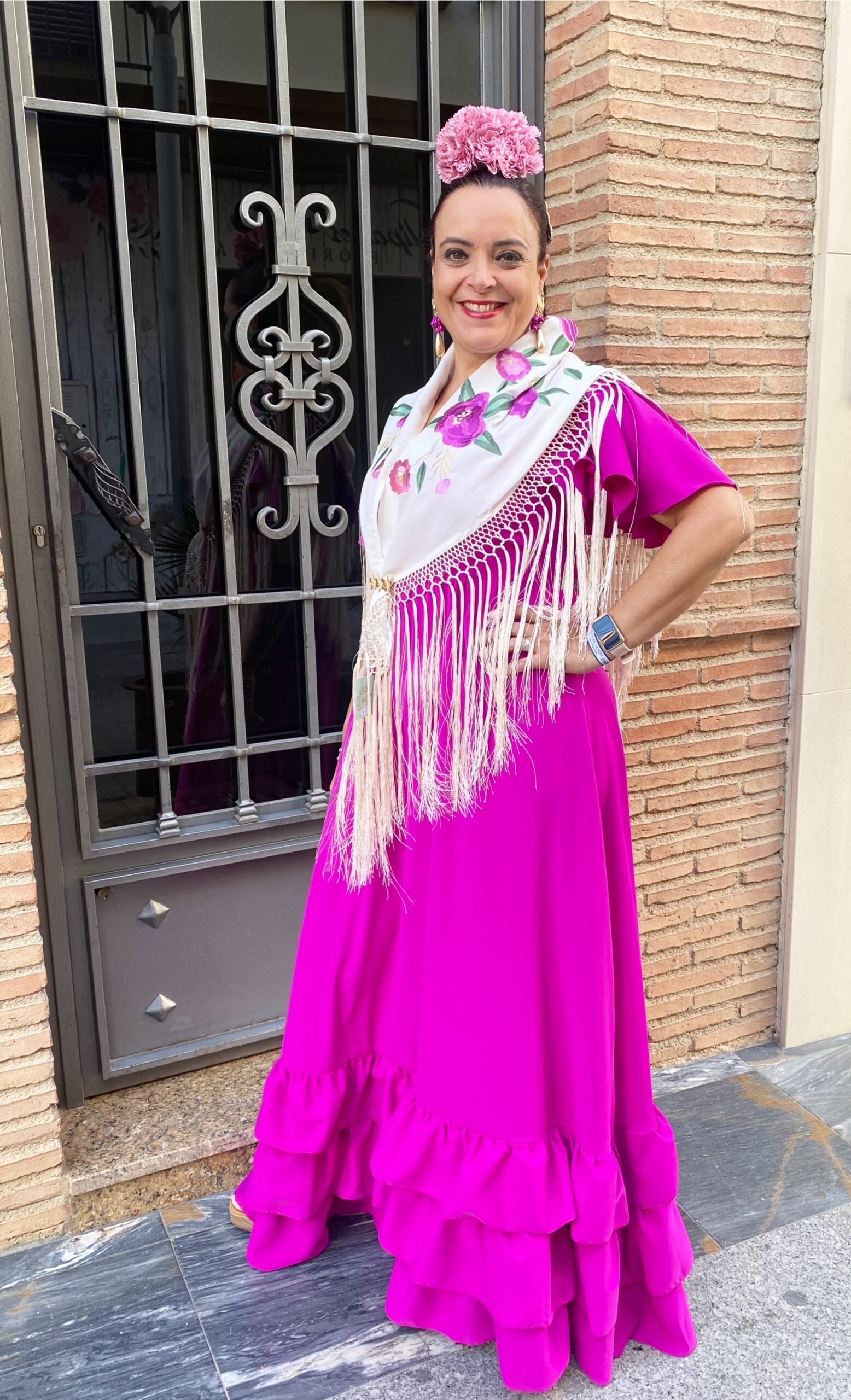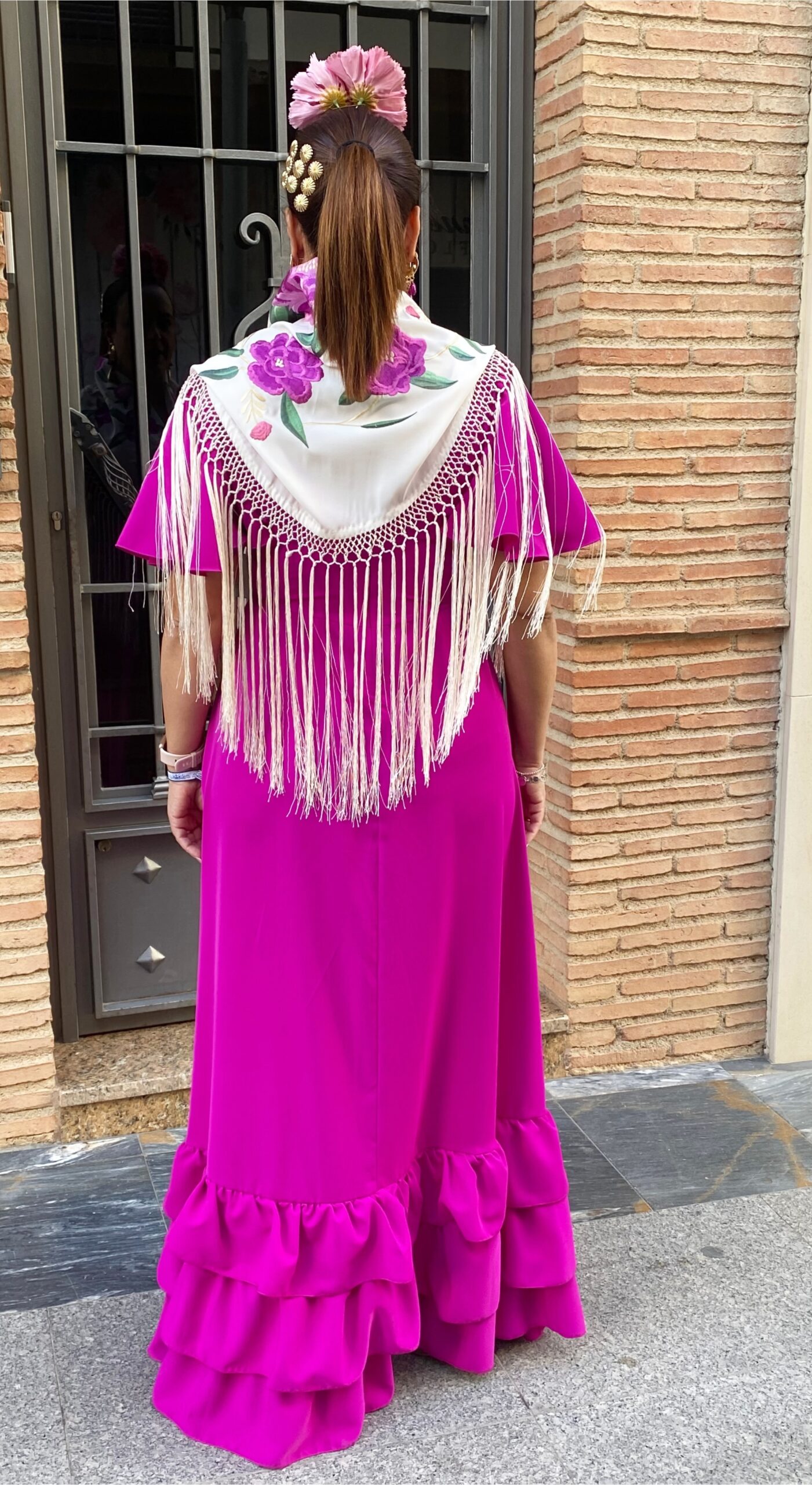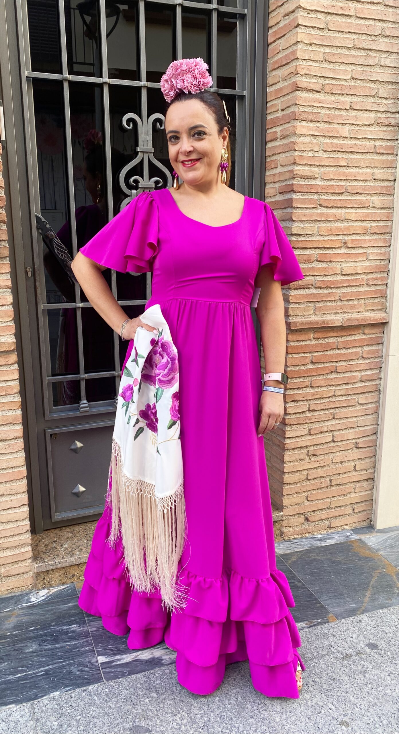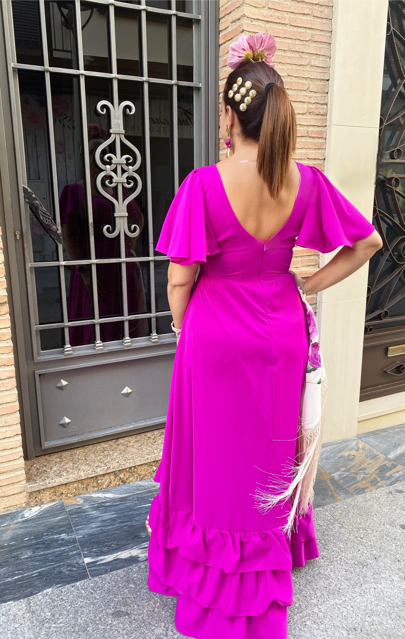 Bata en color buganvilla, corte a la cintura y 3 volantes abajo, hombro con volante mediano a modo de manga corta.