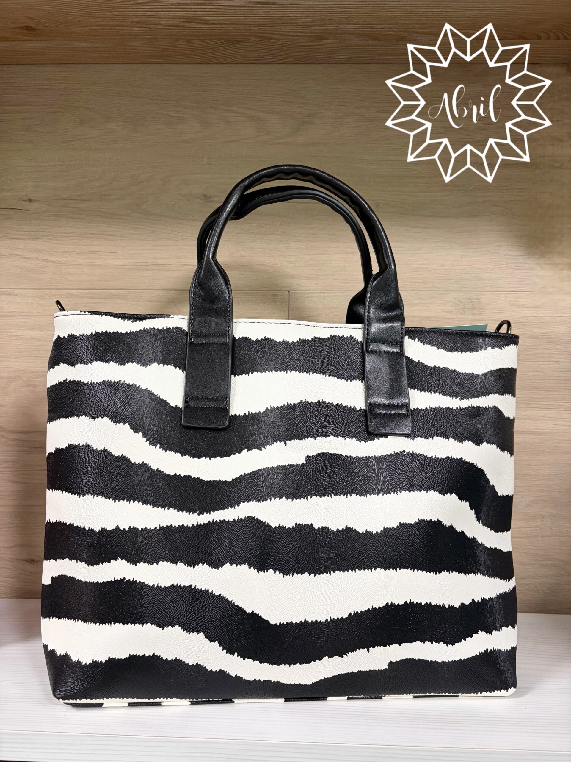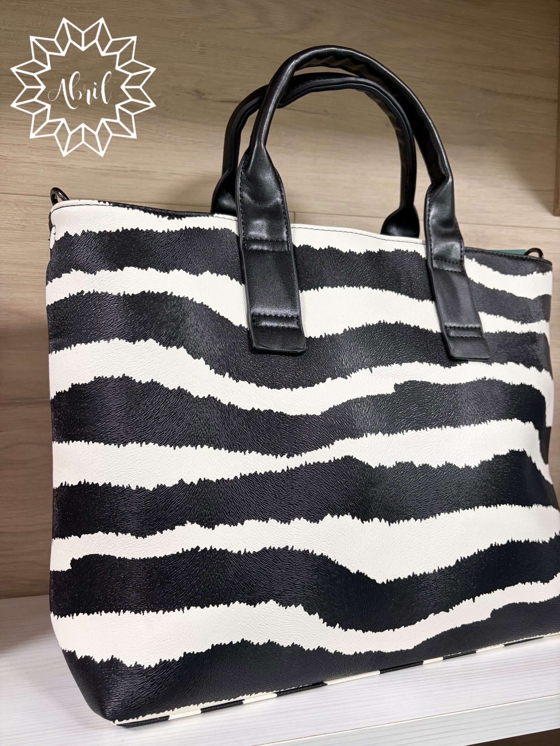 Bolso de tamaño mediano/grande en blanco y negro, con asas cortas y larga para que lo lleves como más te guste.