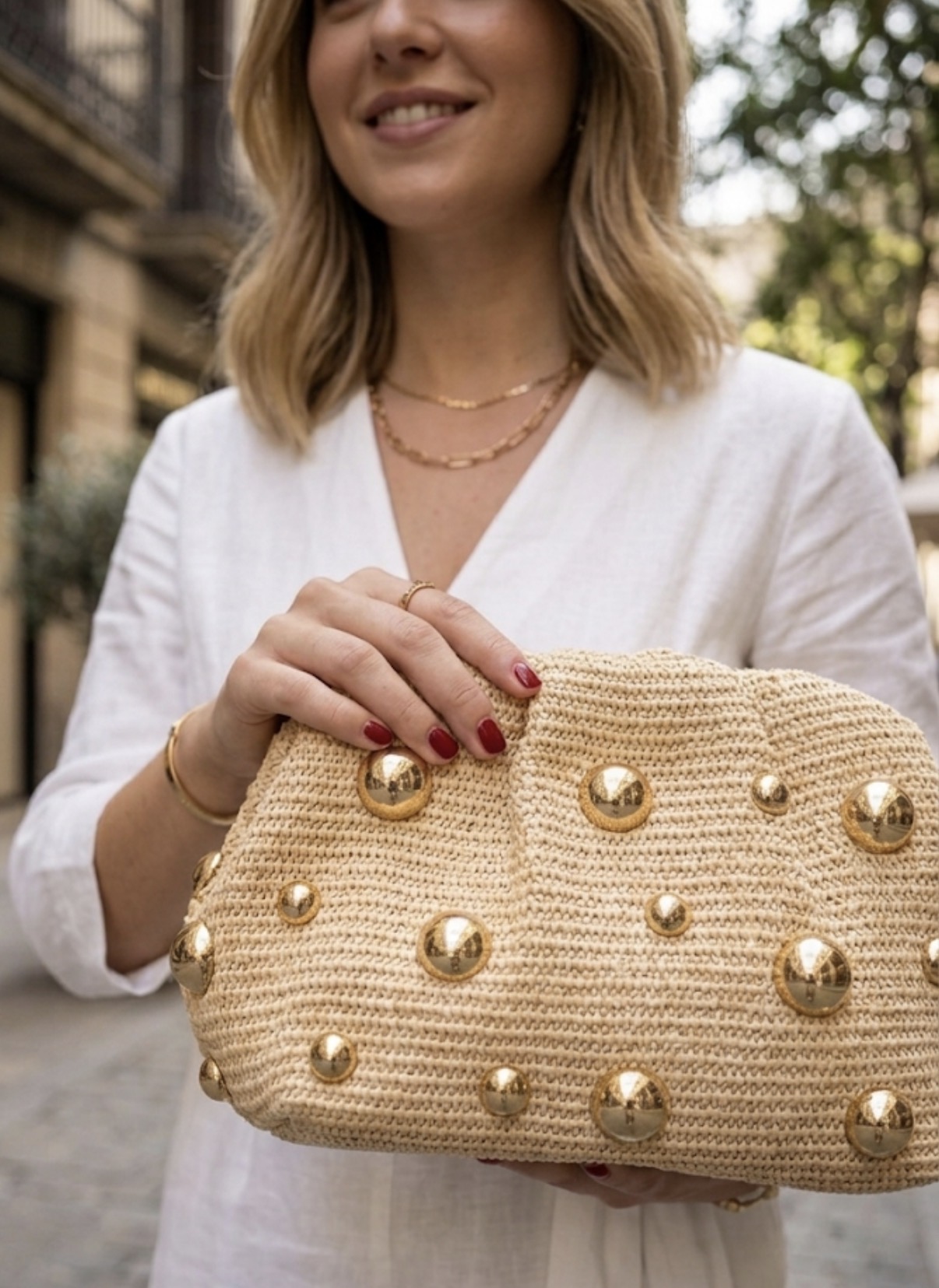 Bolso de rafia pequeño con tachas de diferentes tamaños, dispone de cadena larga dorada para que lo lleves como más te guste.