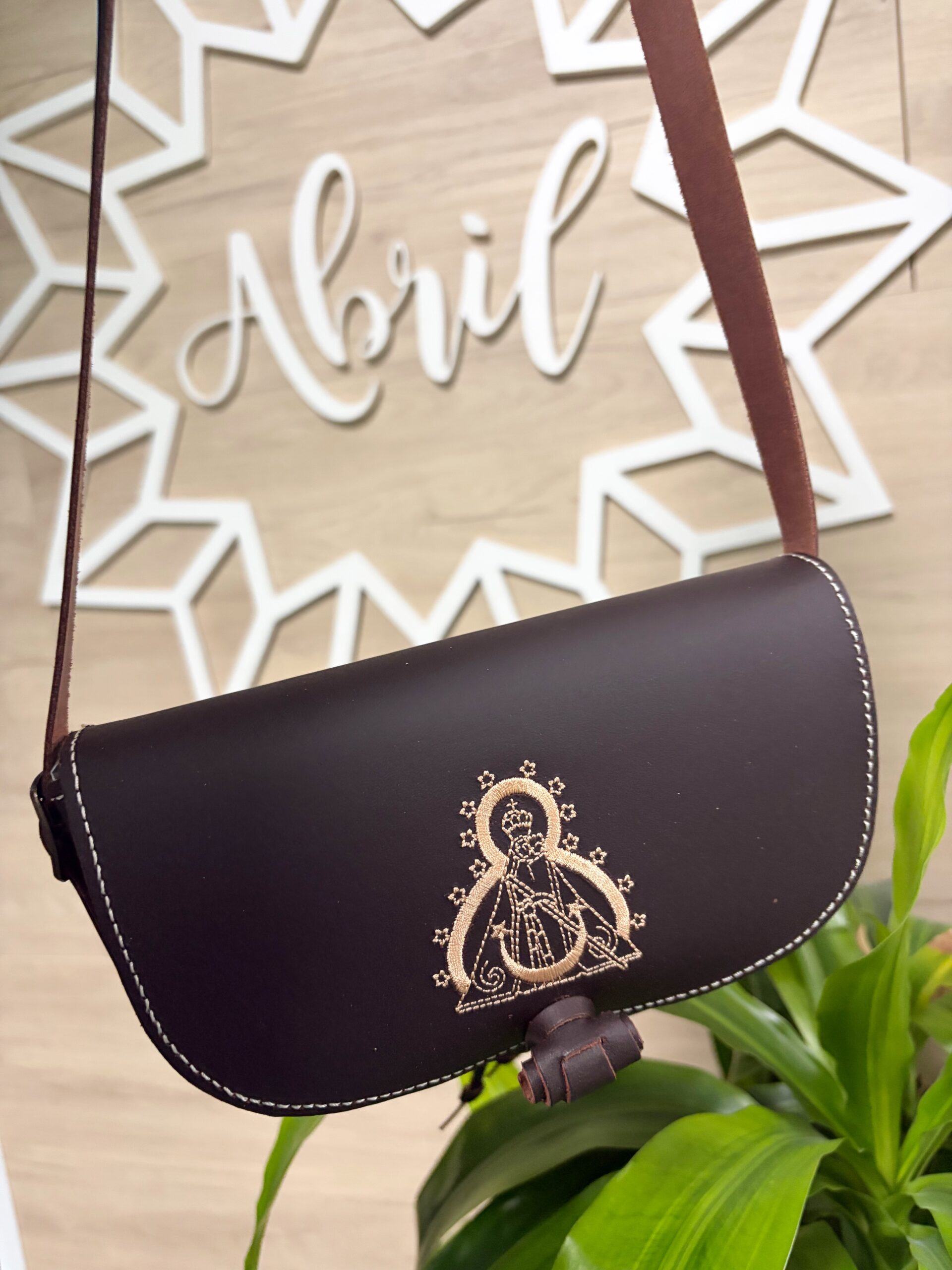 Bolso de piel  con la imagen de la Virgen de la Cabeza bordada, confeccionado en piel de alta calidad.