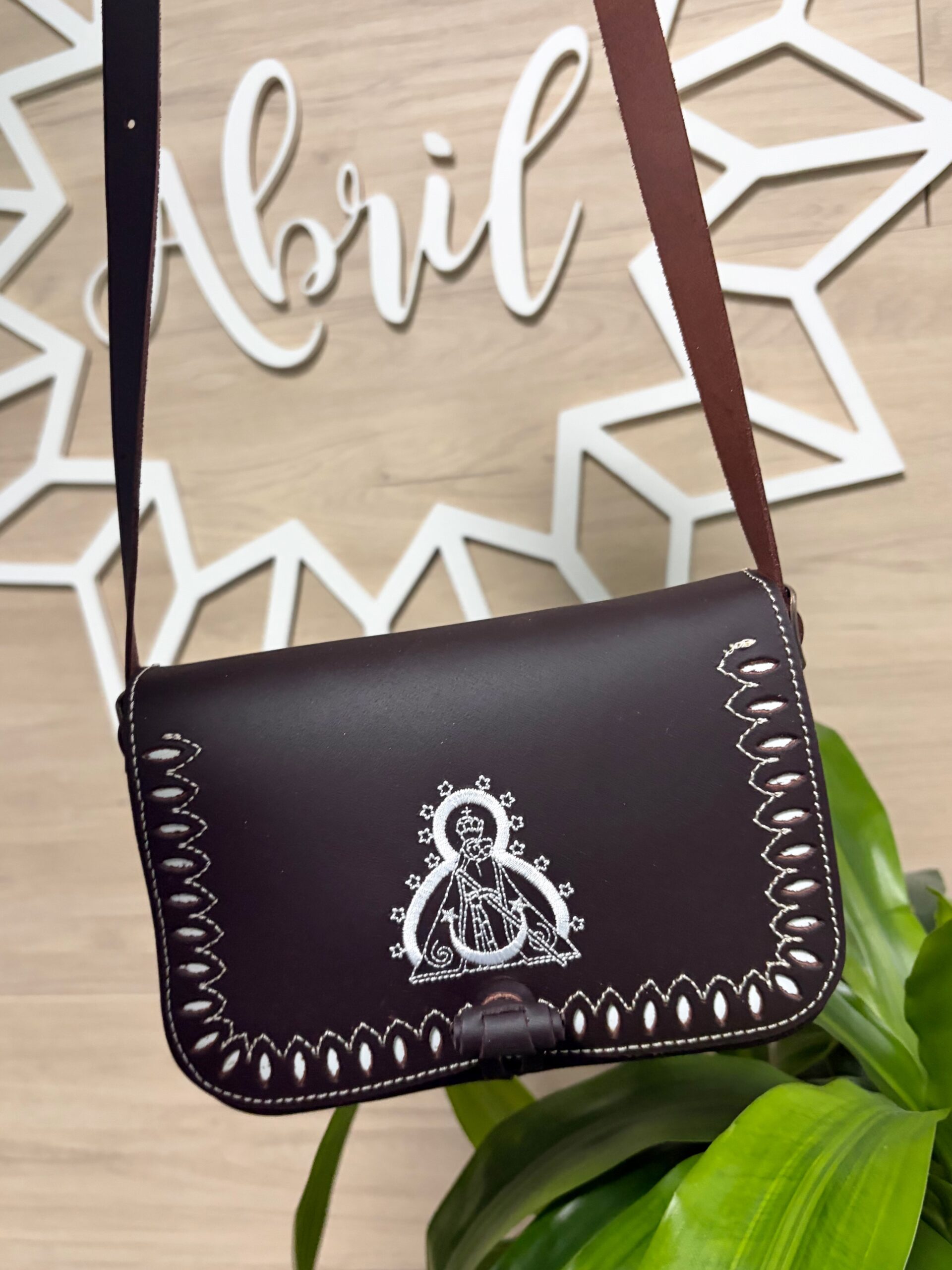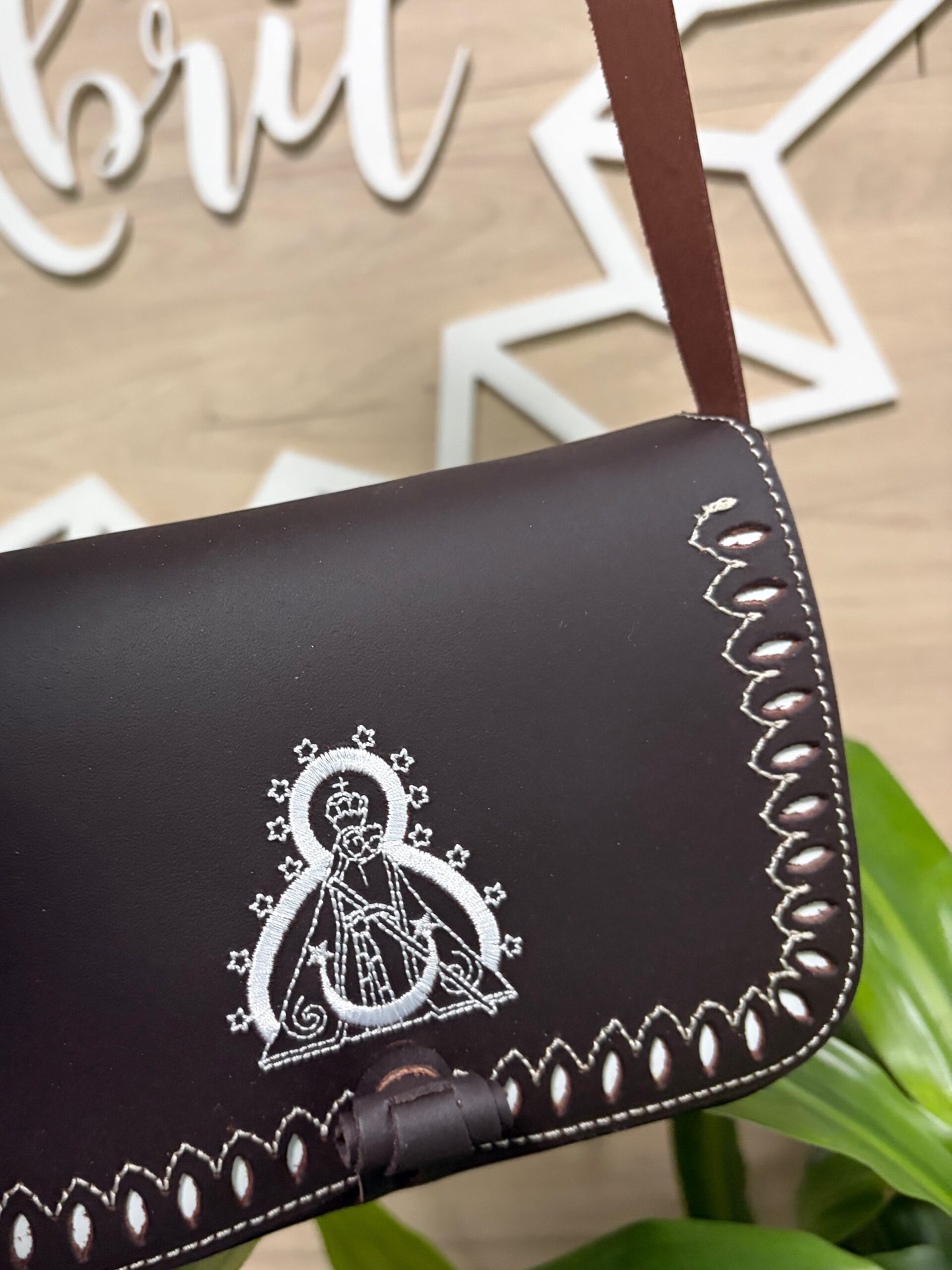 Bolso de piel  con la imagen de la Virgen de la Cabeza bordada, confeccionado en piel de alta calidad.