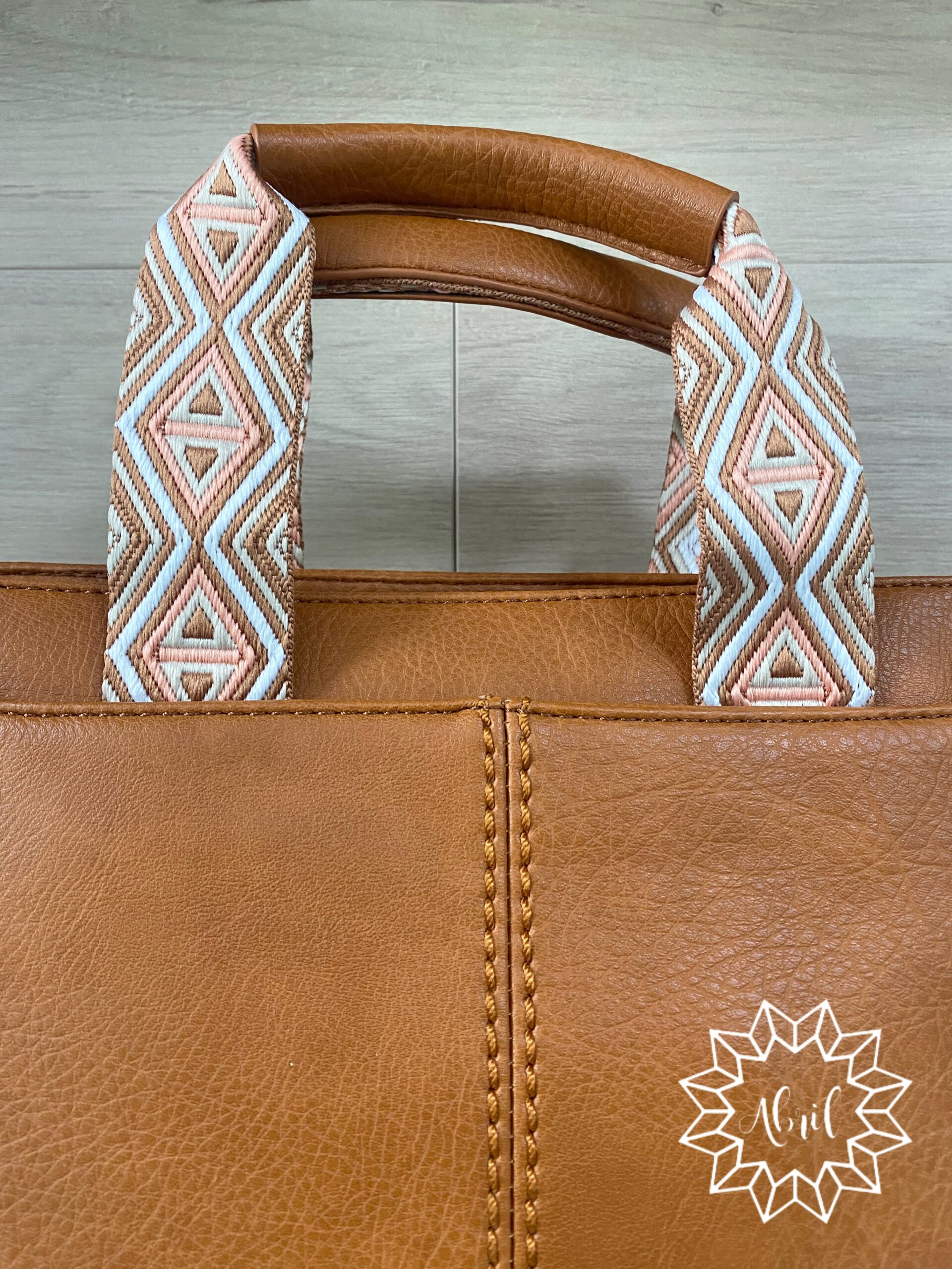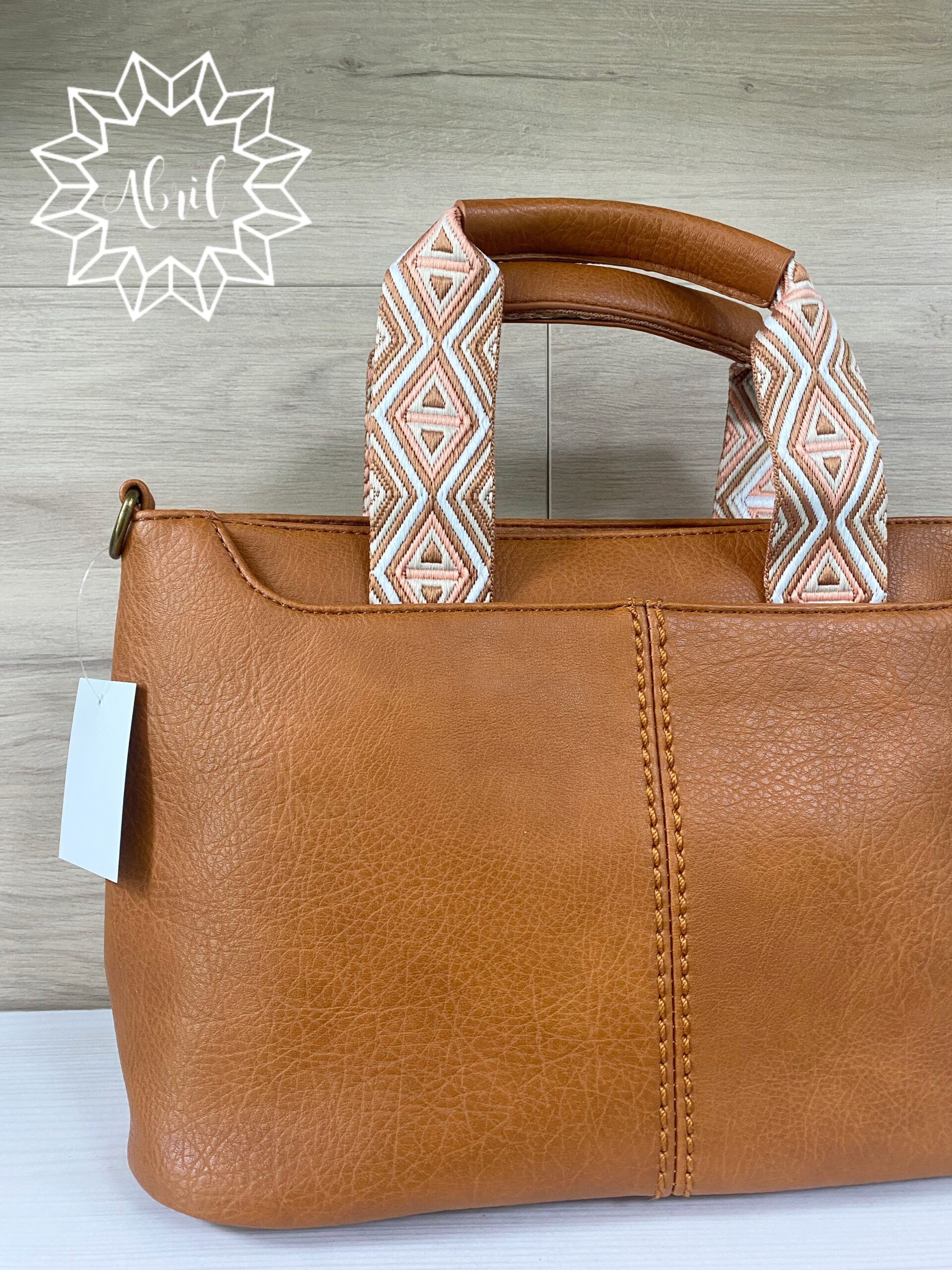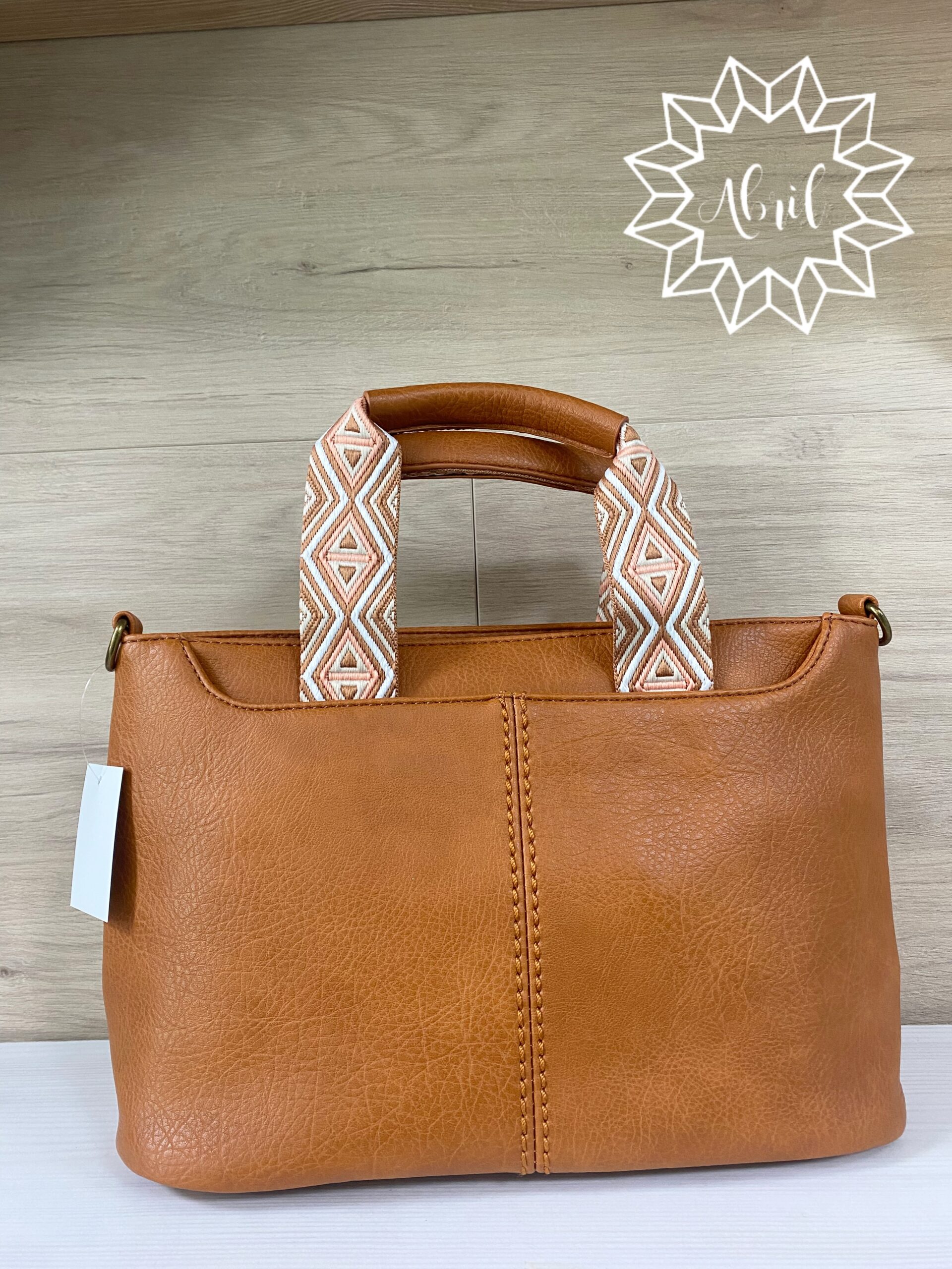 Bolso de tamaño mediano en color camel, con asas cortas estampadas y asa larga fina del mismo color y material.