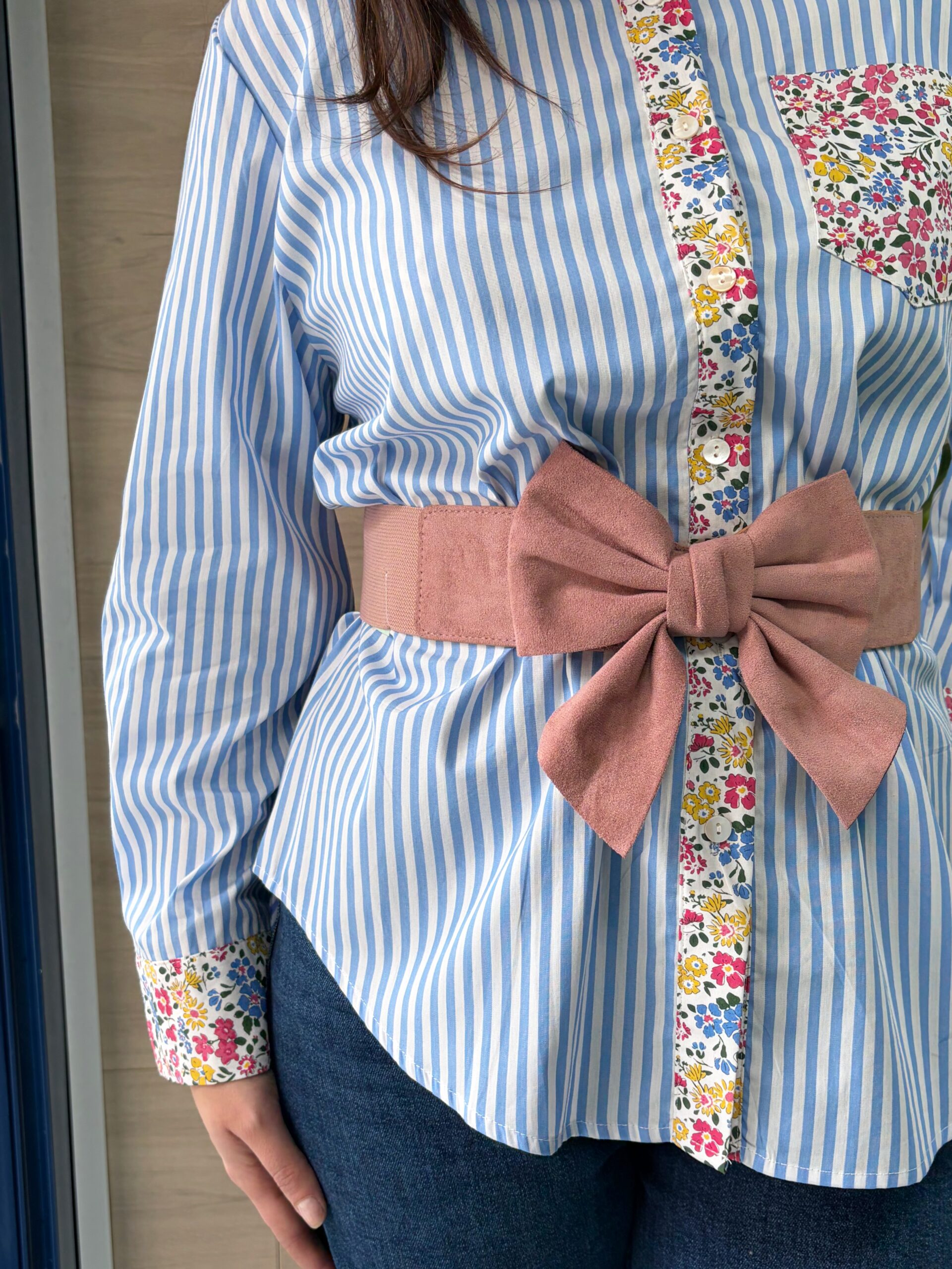 Camisa de rayas en azul y blanca y detalles con flores coloridas.