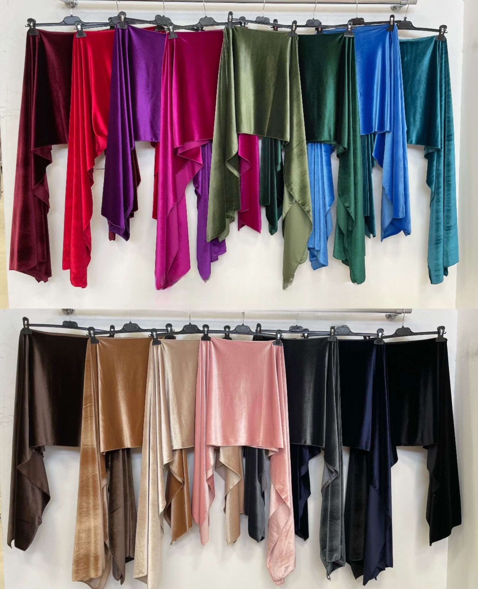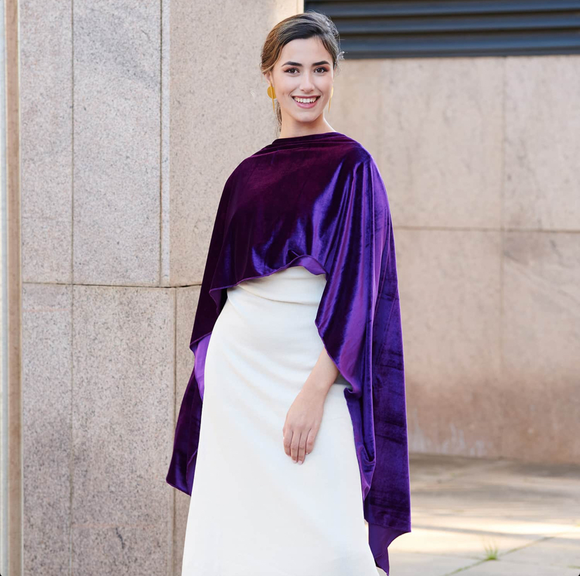 Capa terciopelo invitada, cuello barco y corte a la cintura y la parte de las mangas más largas.