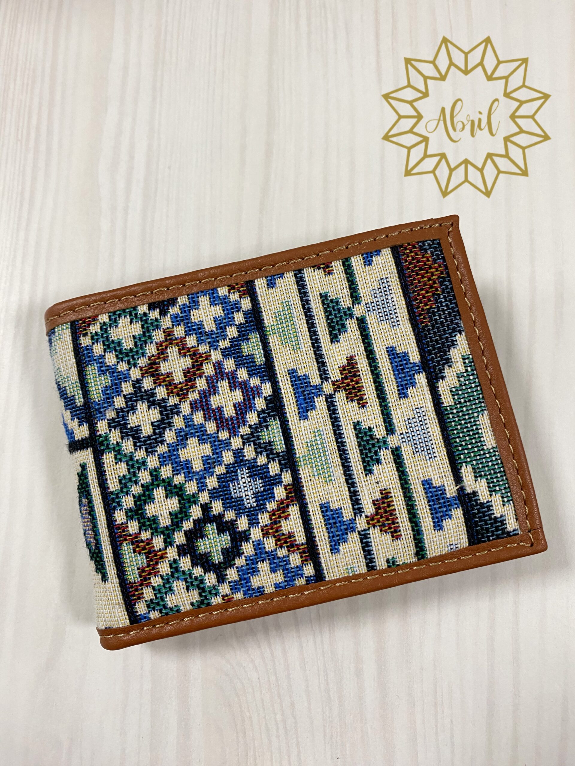 Cartera caballero étnica en tonos azules. Dispone de todo tipo de apartados para monedas, billetes y tarjetas.