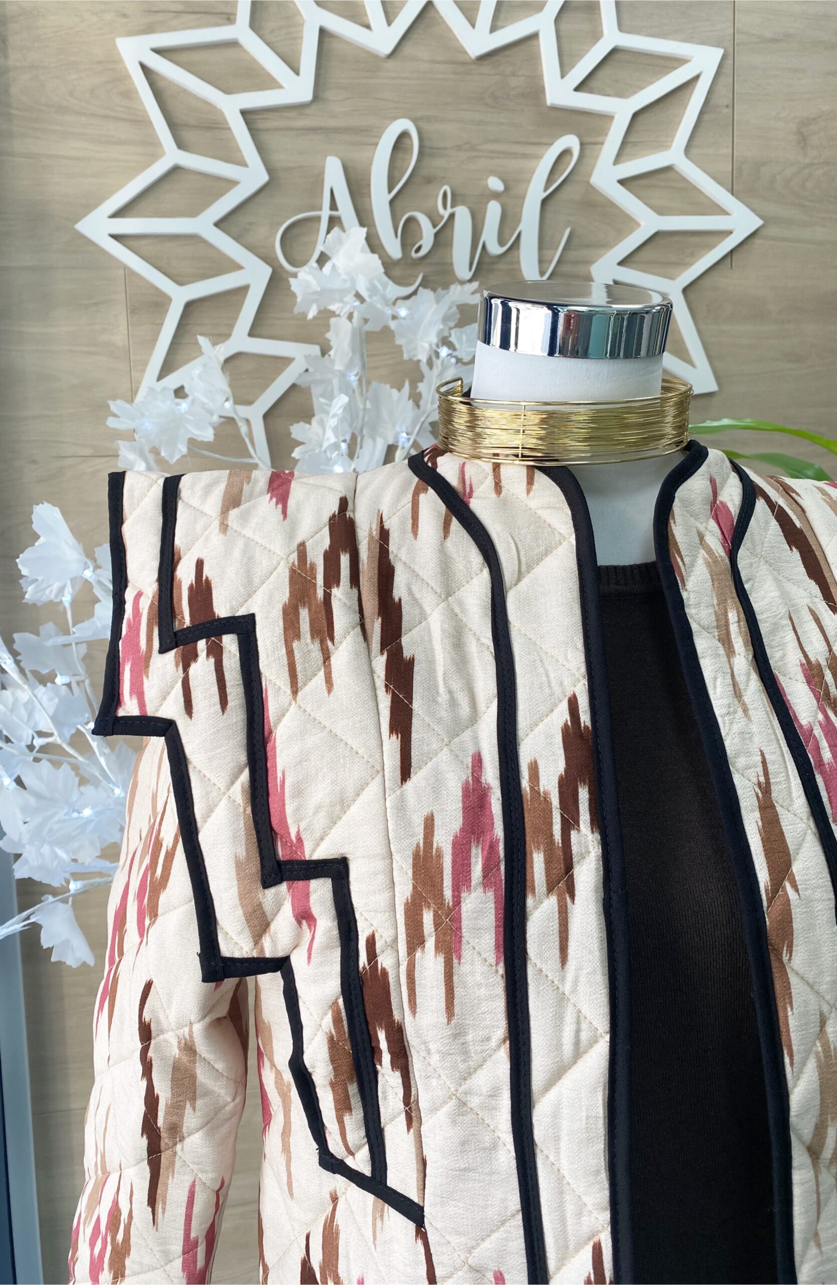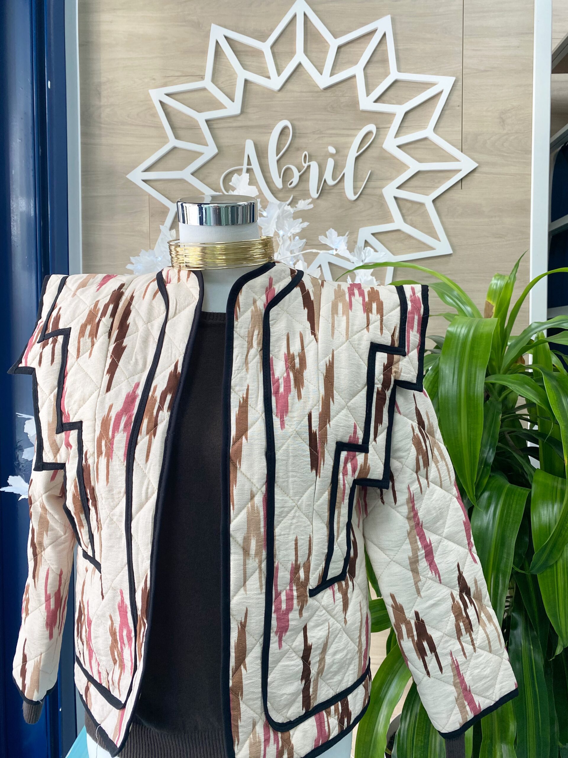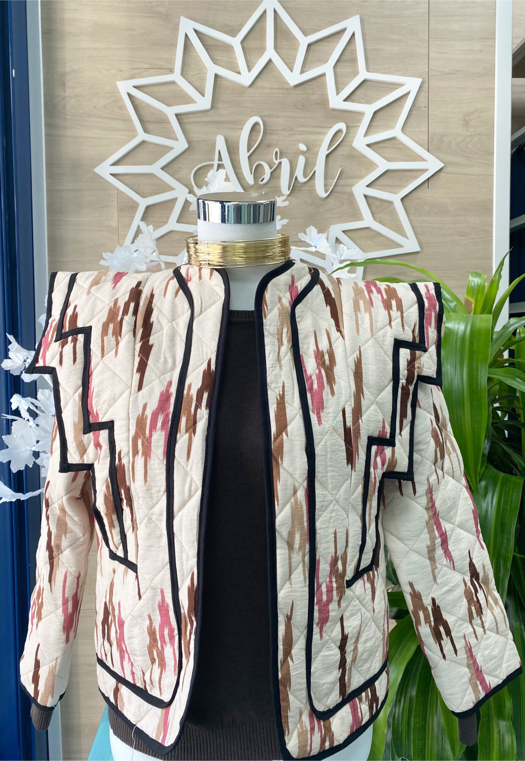 Chaqueta acolchada en tonos beige, marrón y maquillaje, detalle de hombreras.