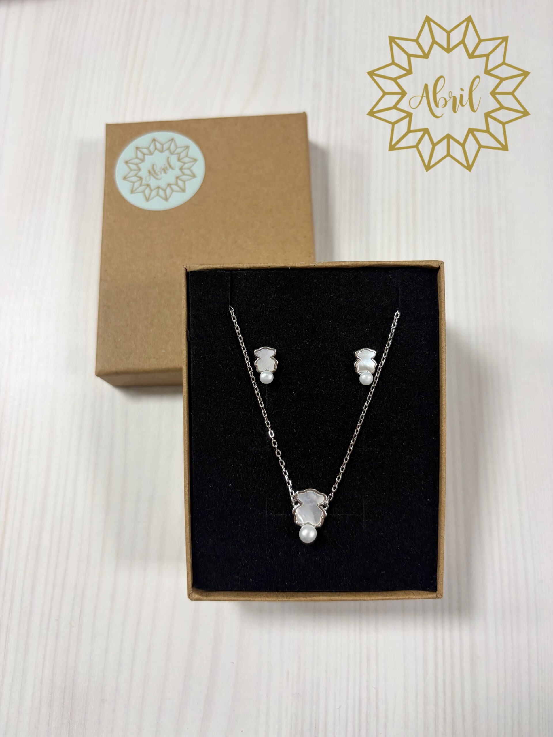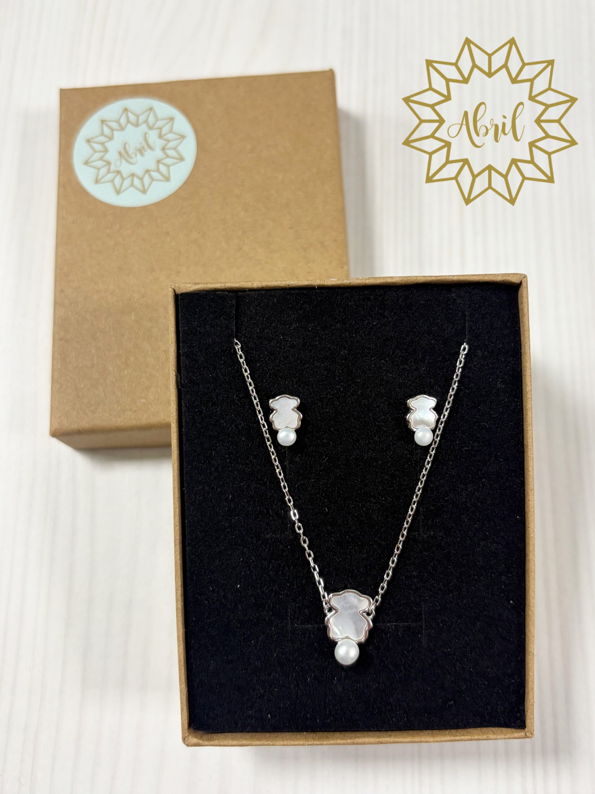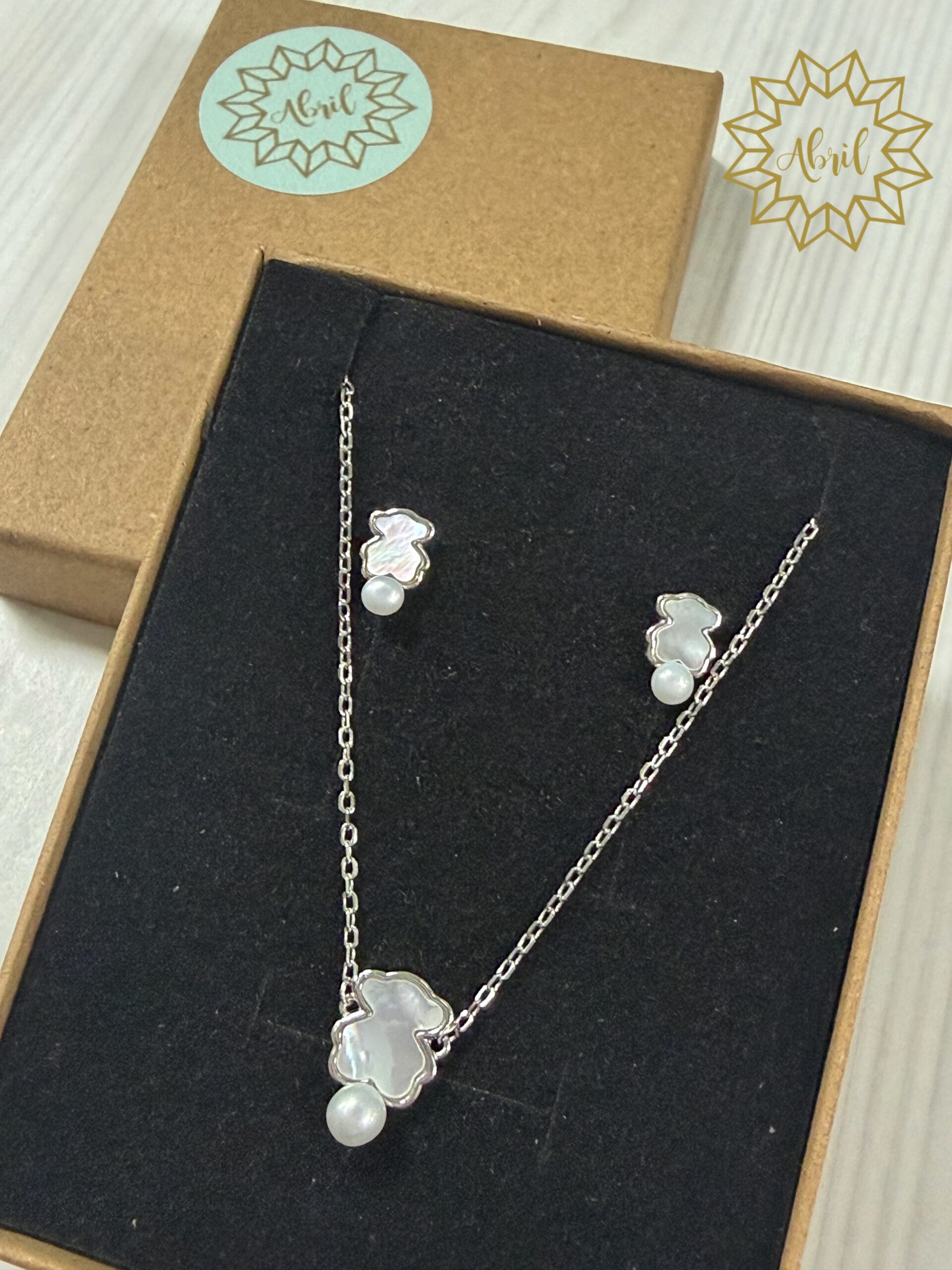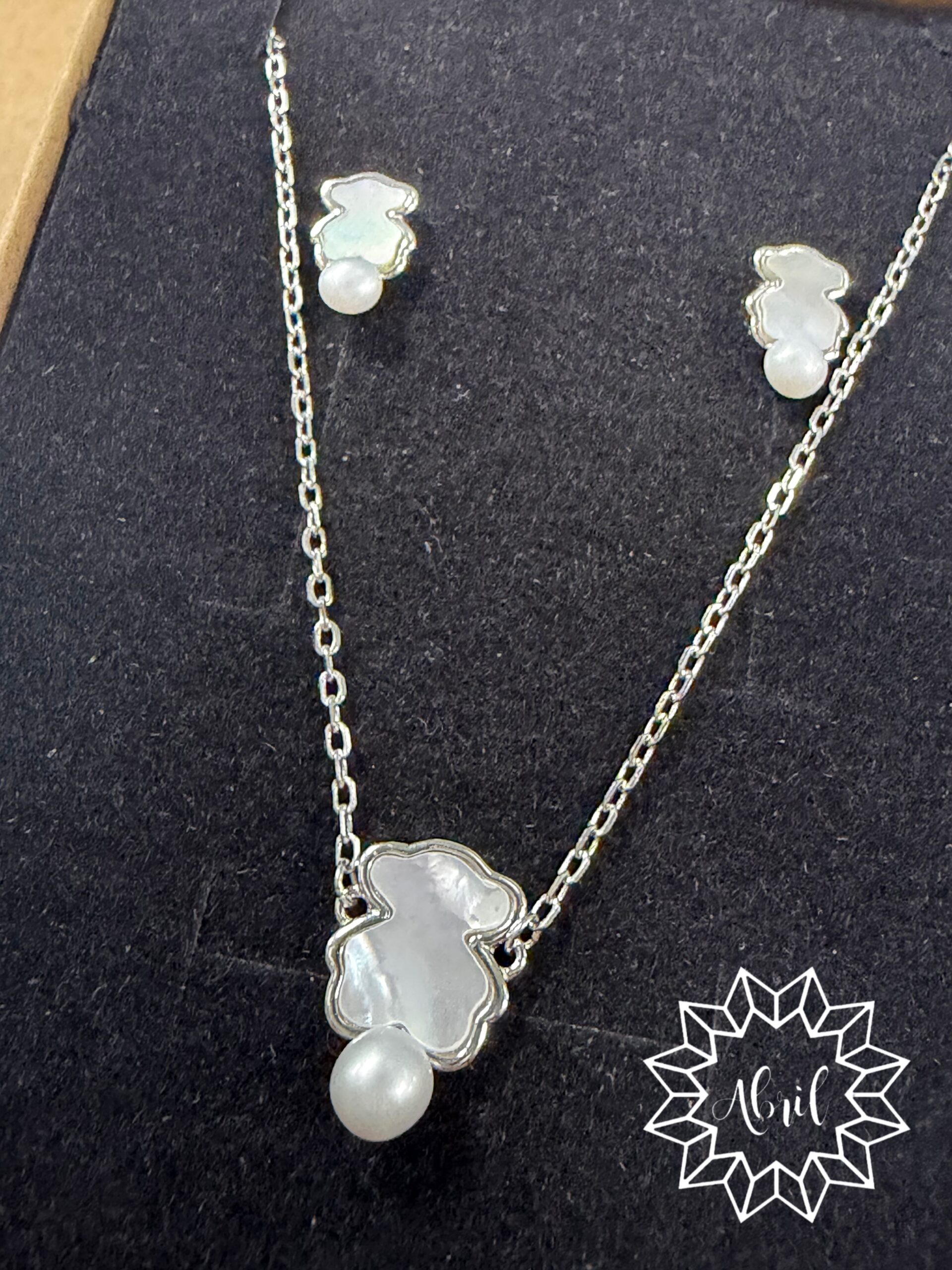 Conjunto de gargantilla y pendientes de ositos anacarados en PLATA DE LEY.