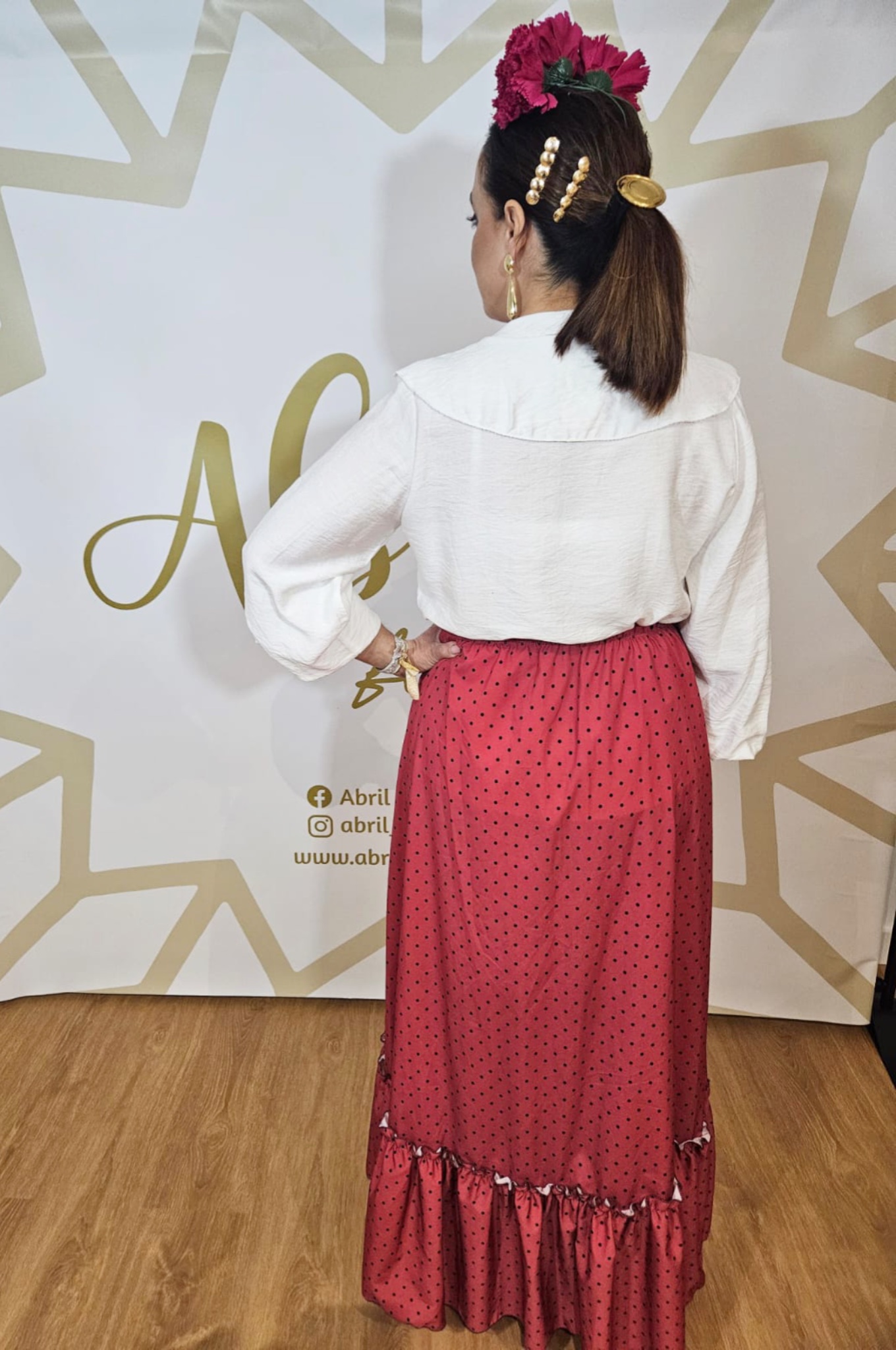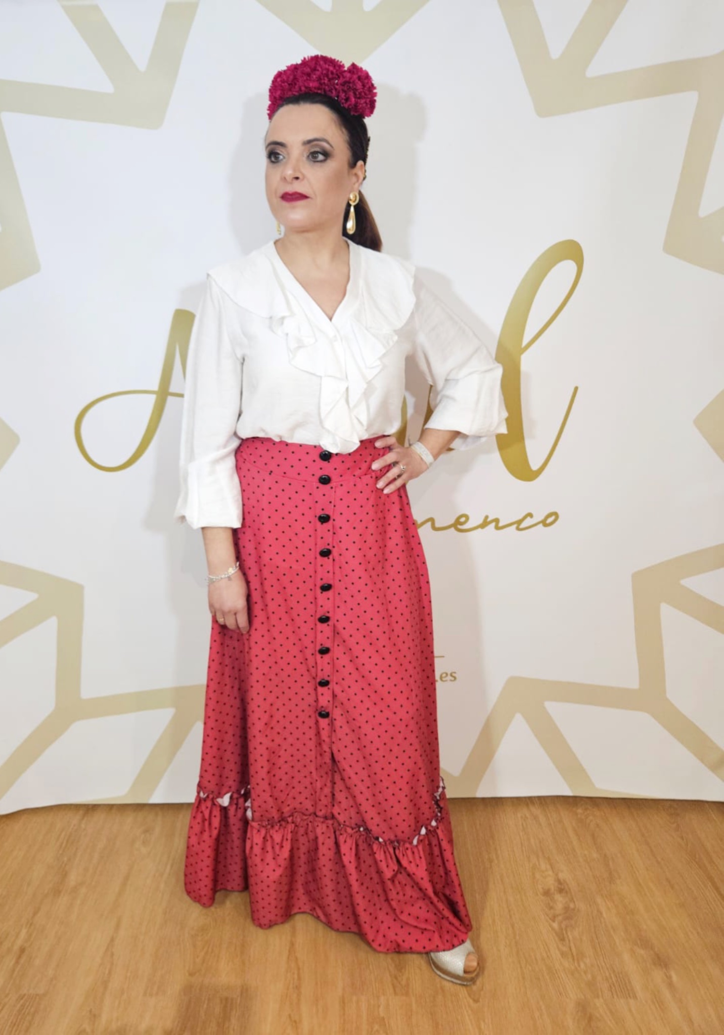 Falda ligera magenta con lunarillos negros, botones decorativos en la parte delantera y volantón abajo. Con goma en la parte trasera de la cintura.
