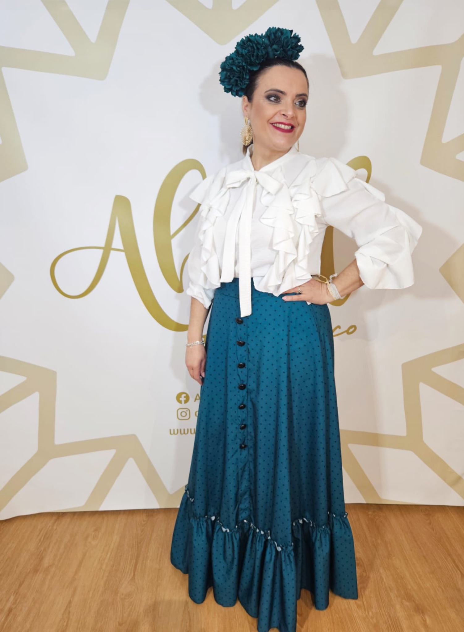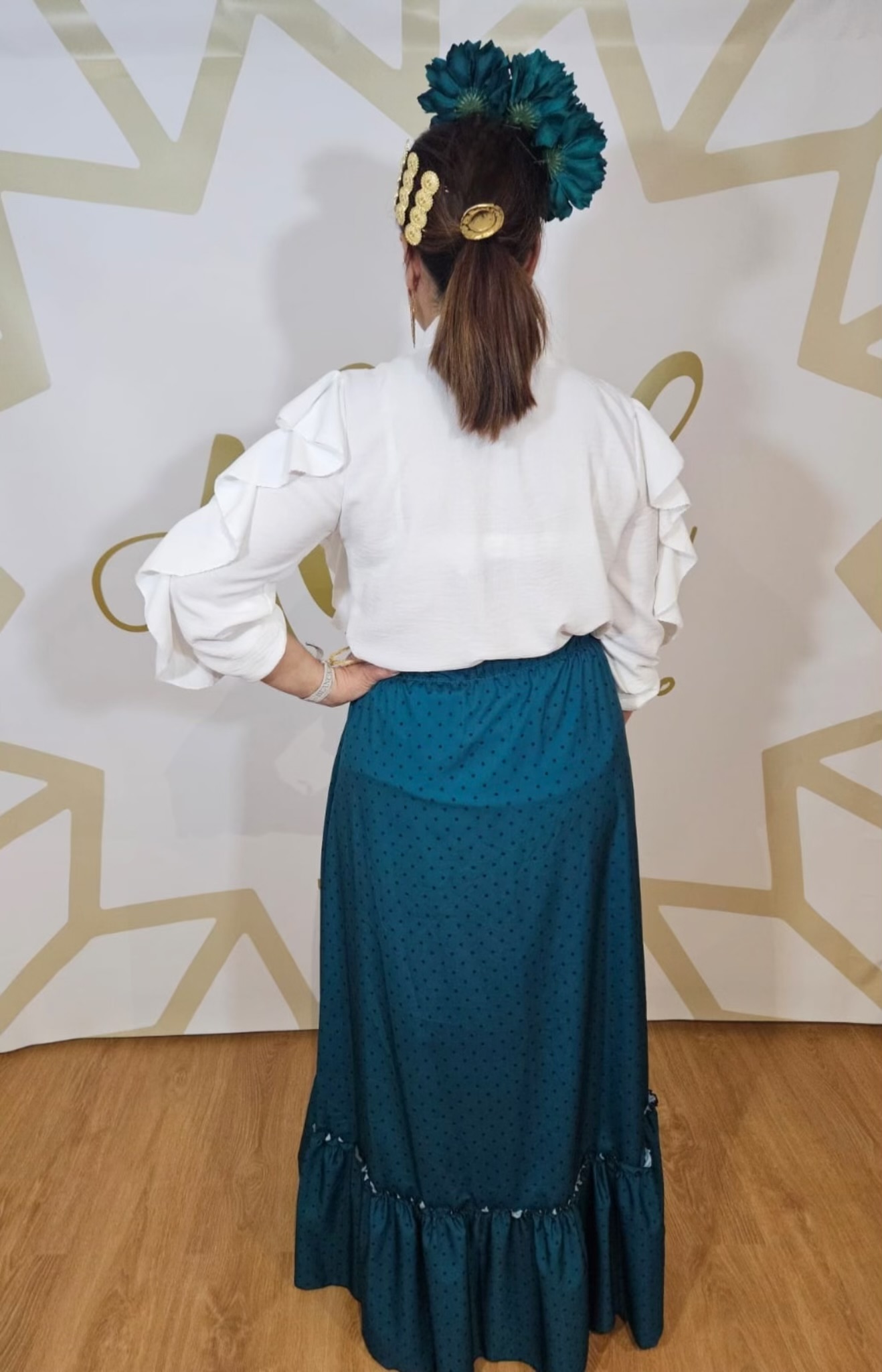 Falda ligera verde pato con lunarillos negros, botones decorativos en la parte delantera y volantón abajo. Con goma en la parte trasera de la cintura.