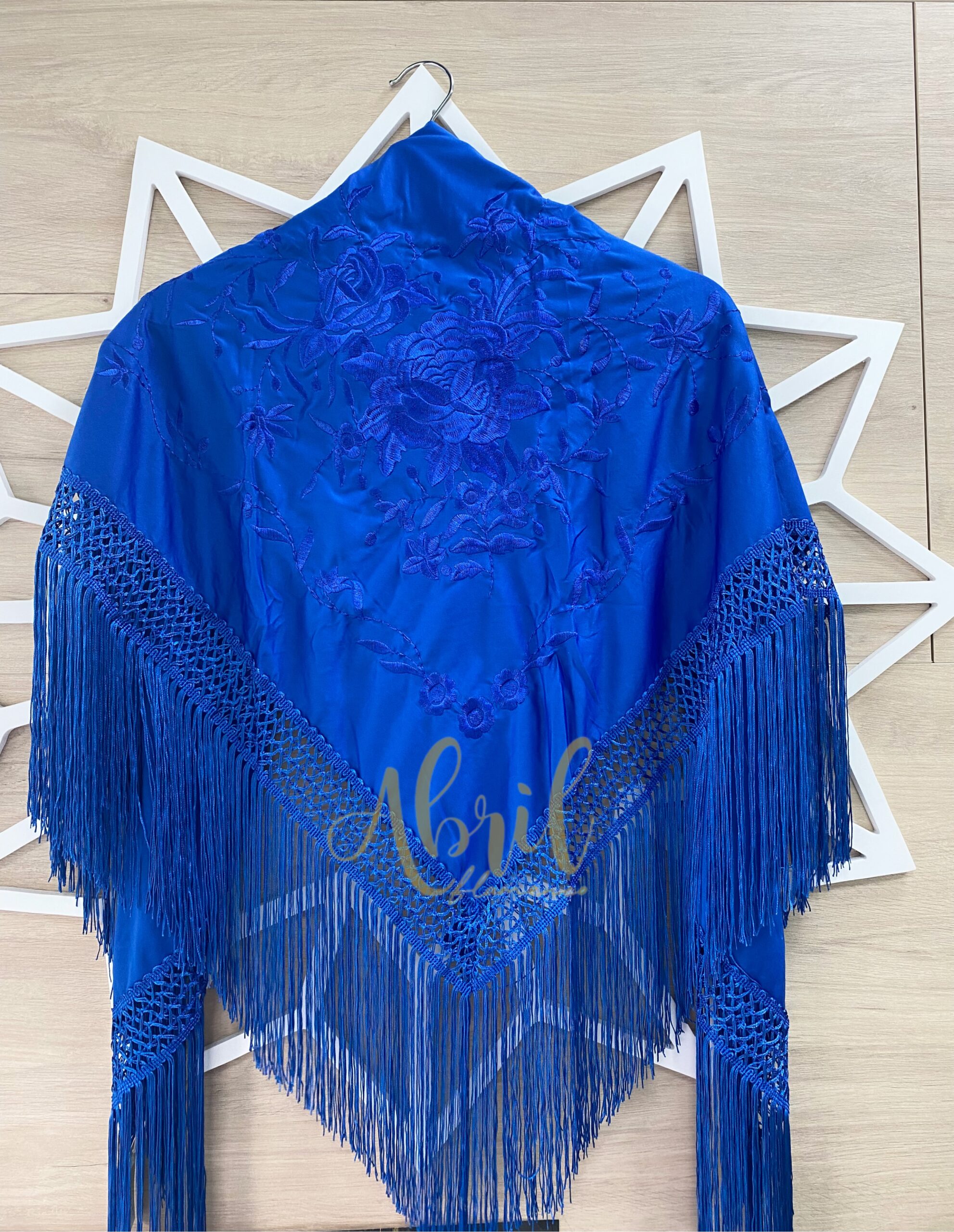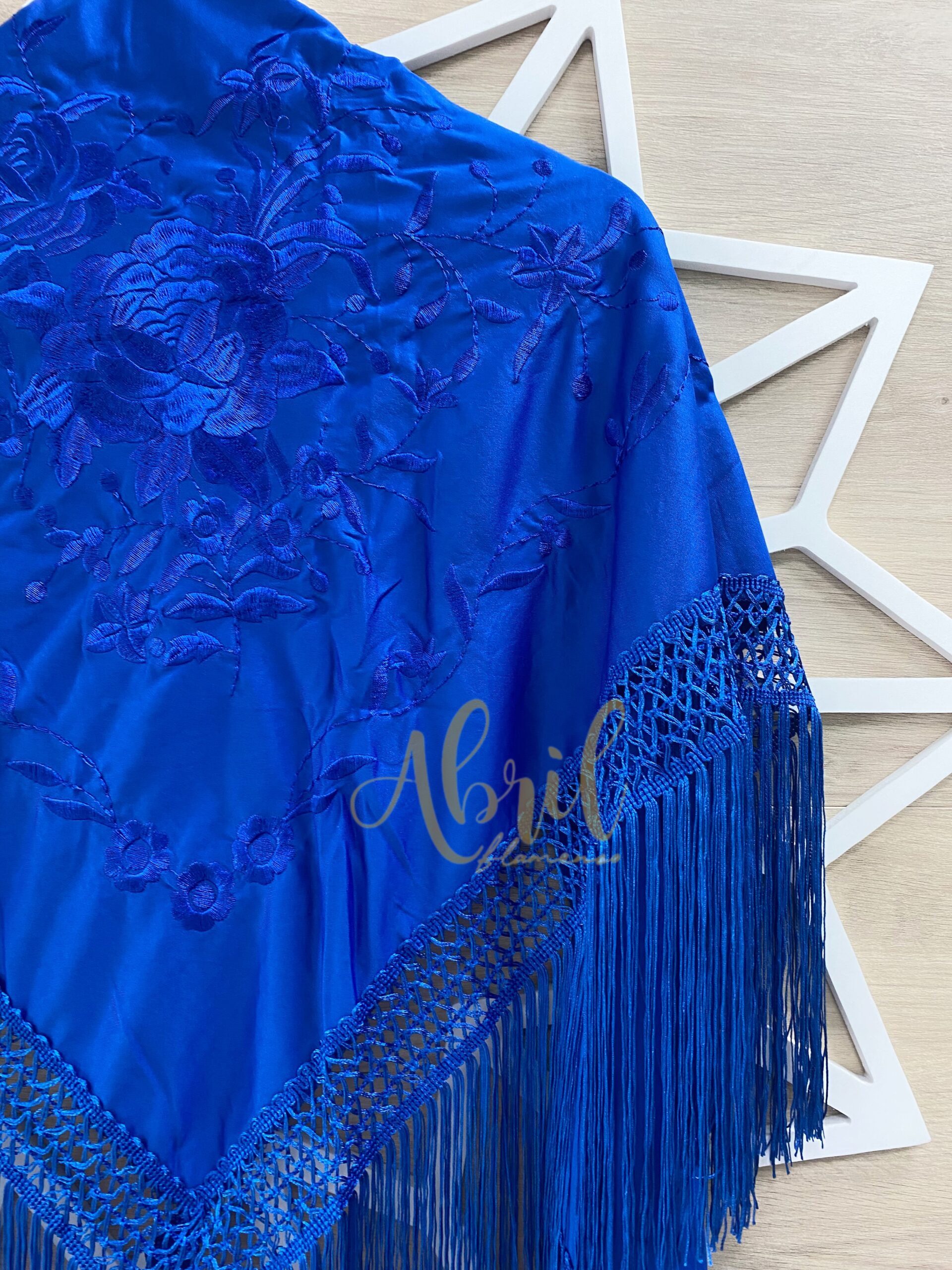 Mantón color azulónbordado en azulón con fleco a máquina y fleco medio.