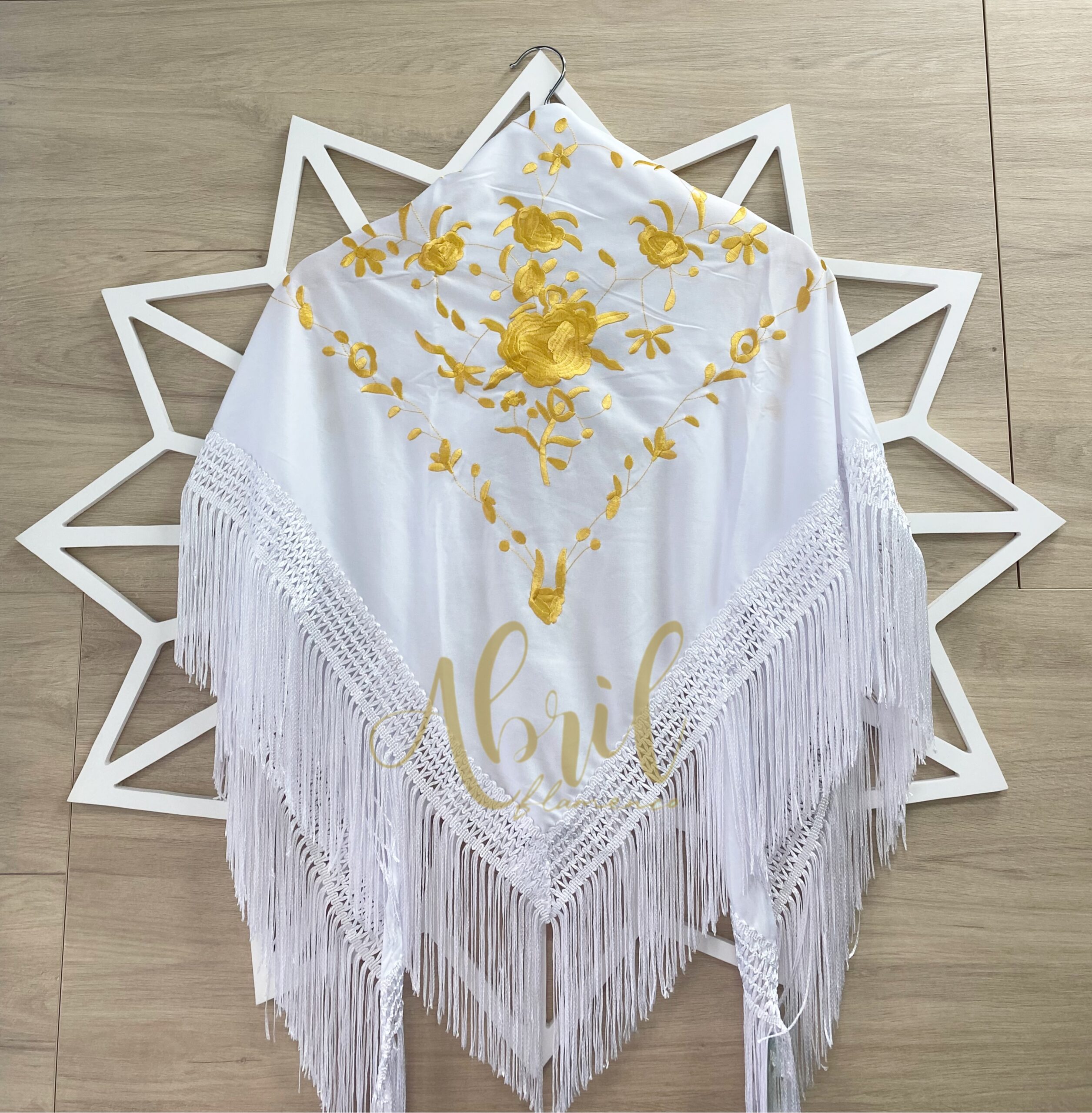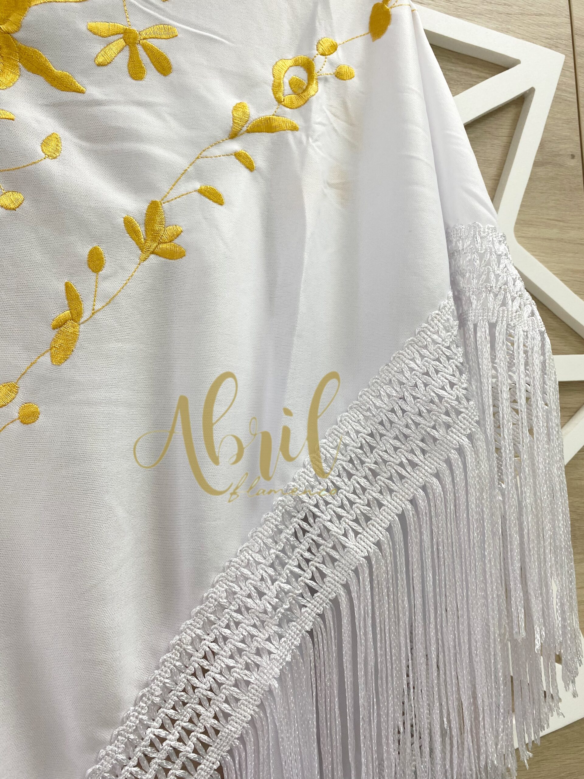 Mantón color blanco bordado en dorado con fleco a máquina y fleco medio.