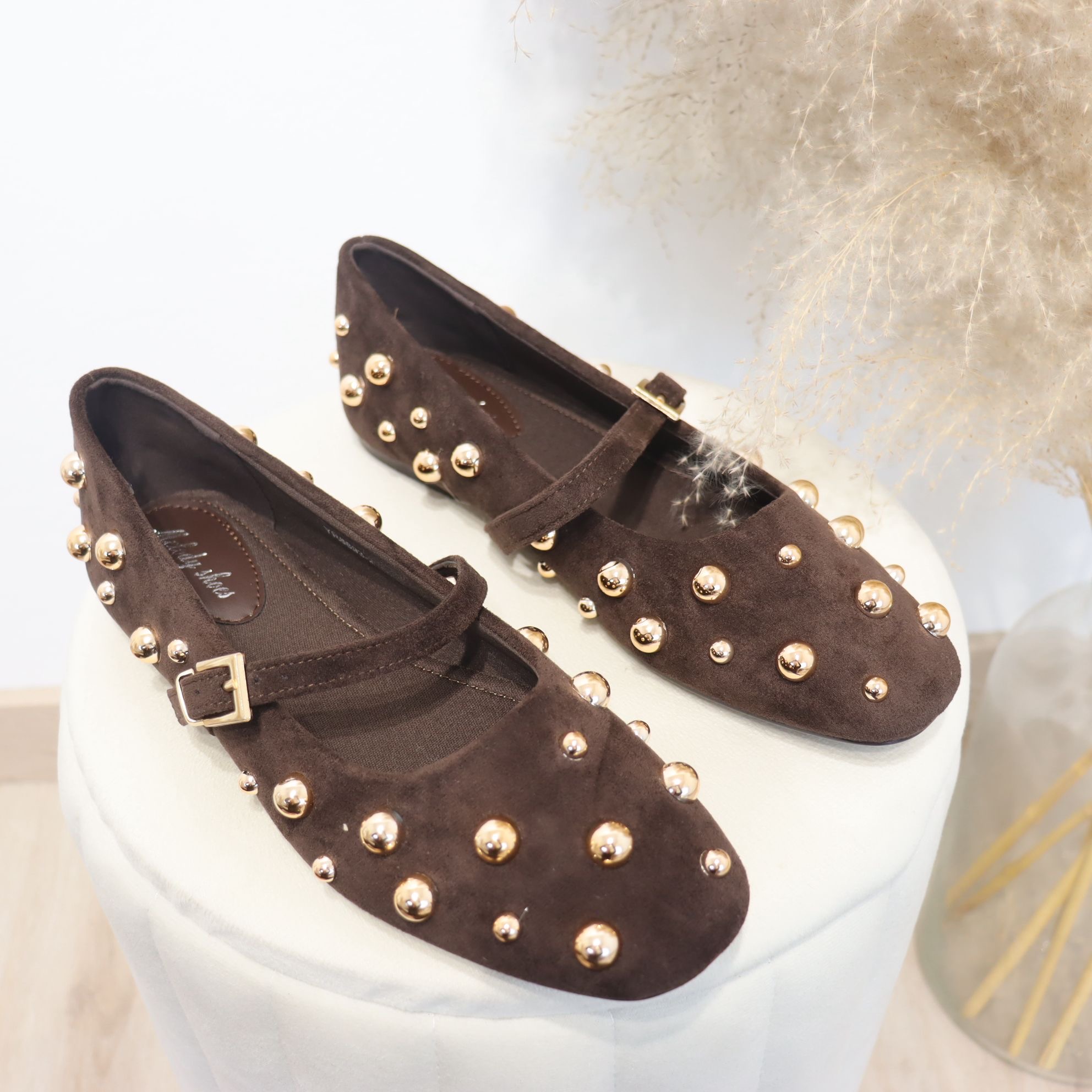 Merceditas en color marrón chocolate  con tachas en dorada, son monísimas y súper cómodas.