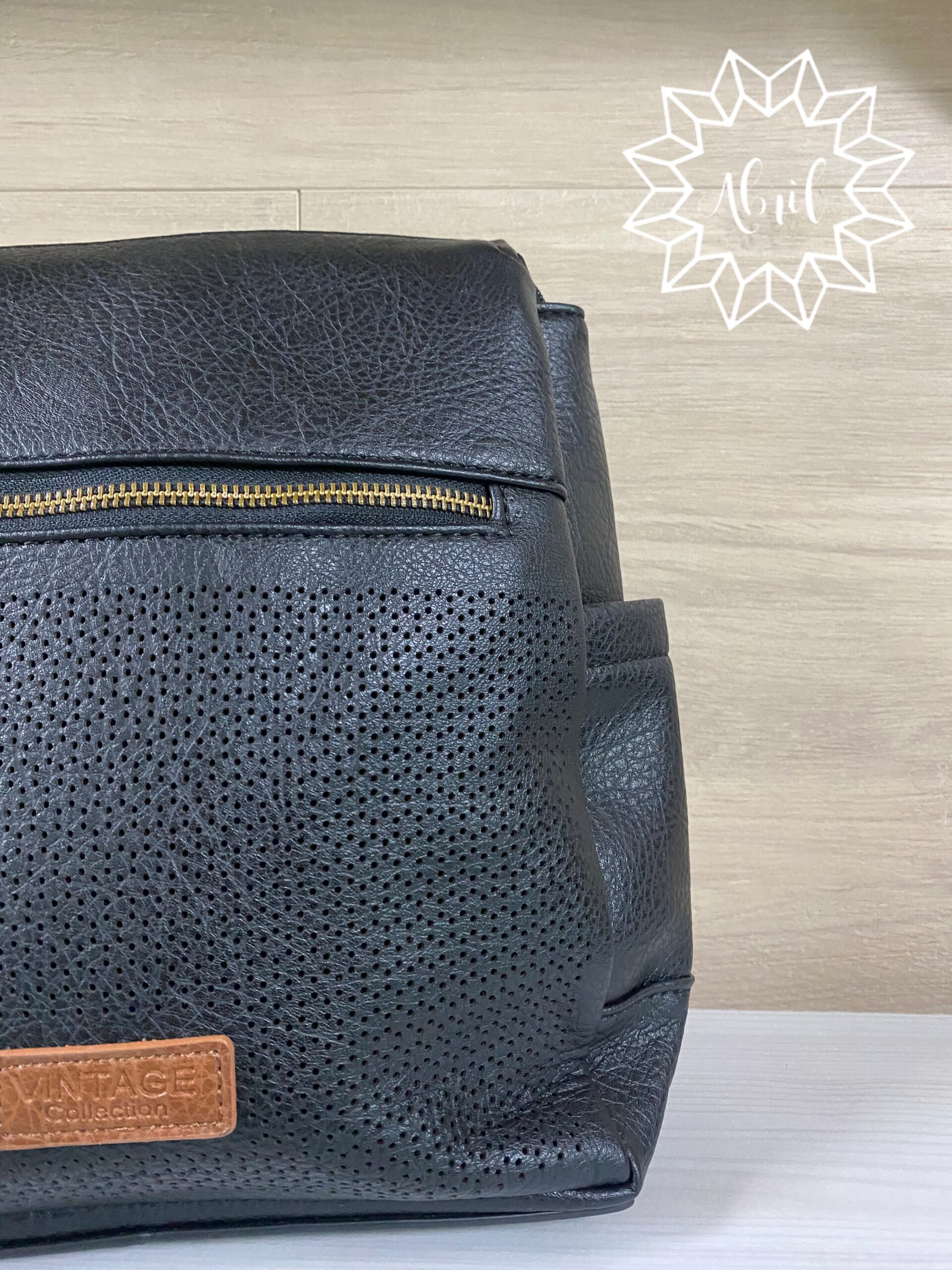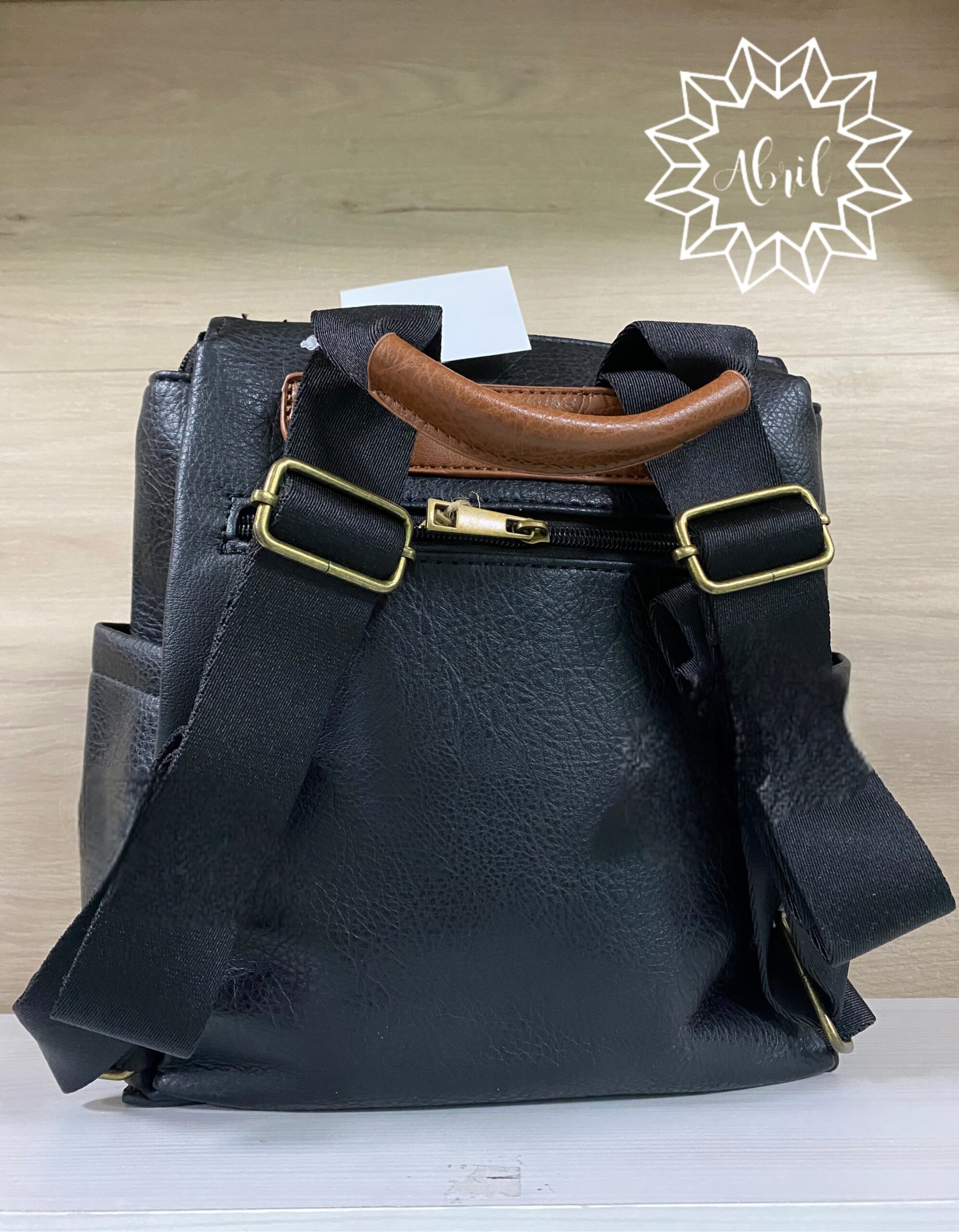 Mochila de material en negra, varios compartimentos y con detalle en marrón.