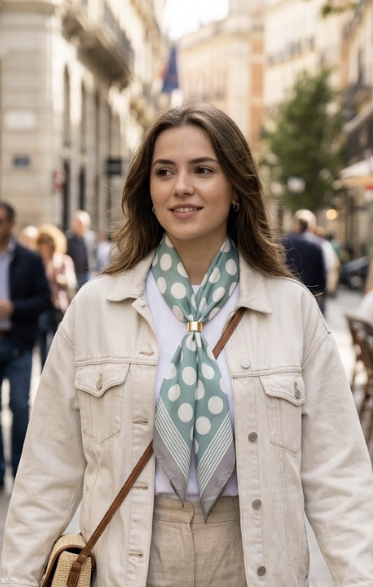 Pañuelo corto verde menta con lunares en beige y con anilla incluida.