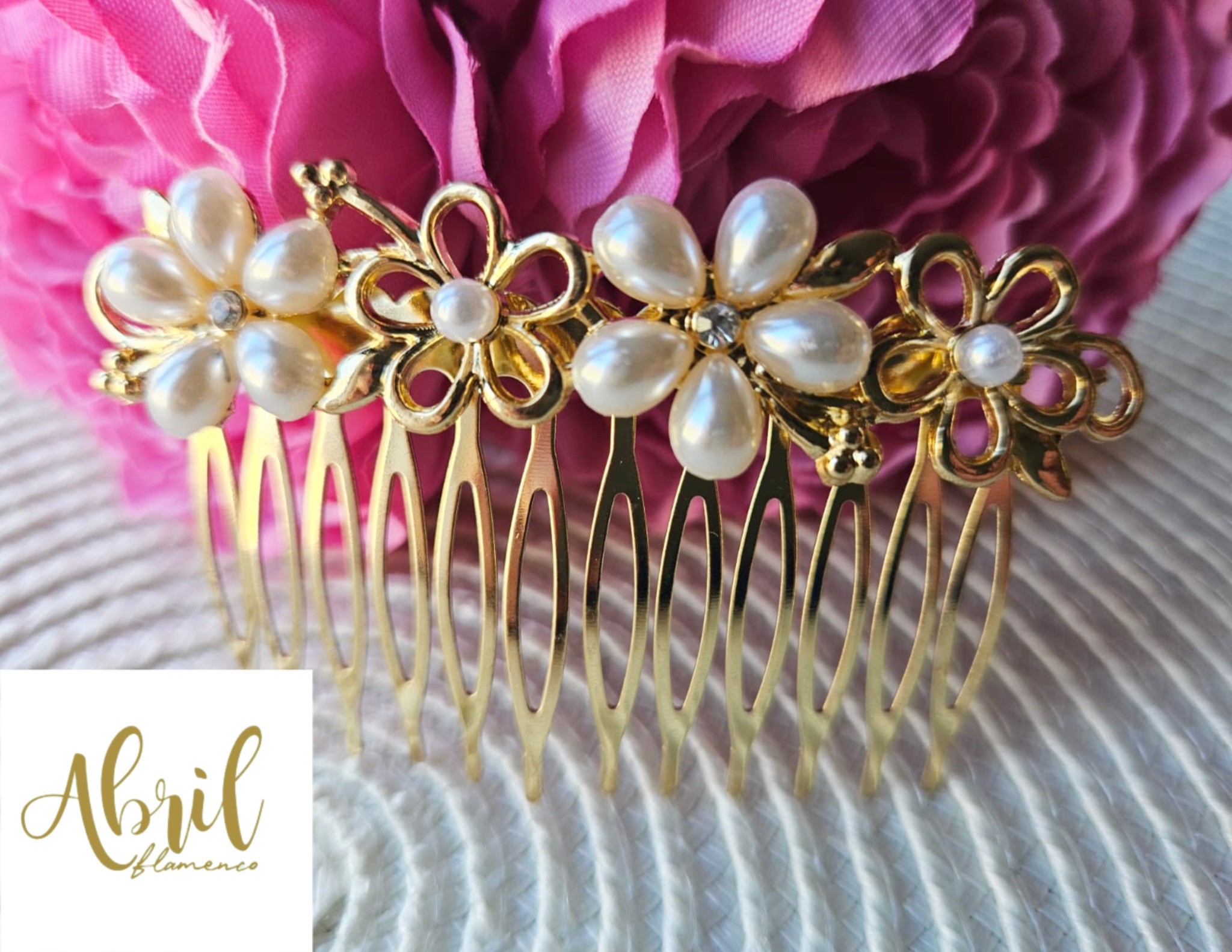 Peina flamenca flores perlas y dorado.