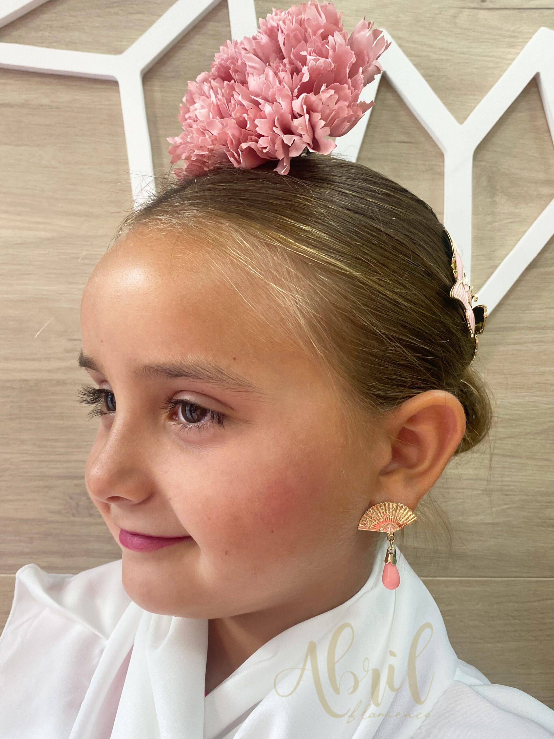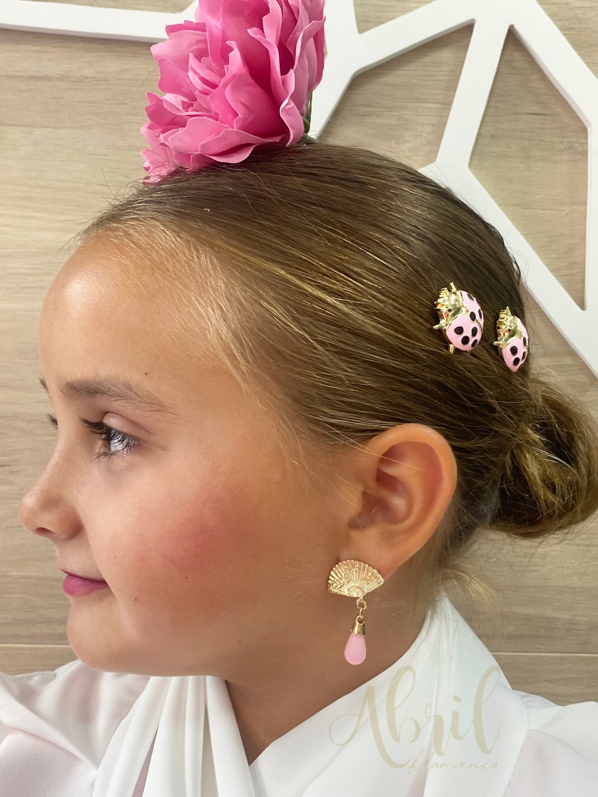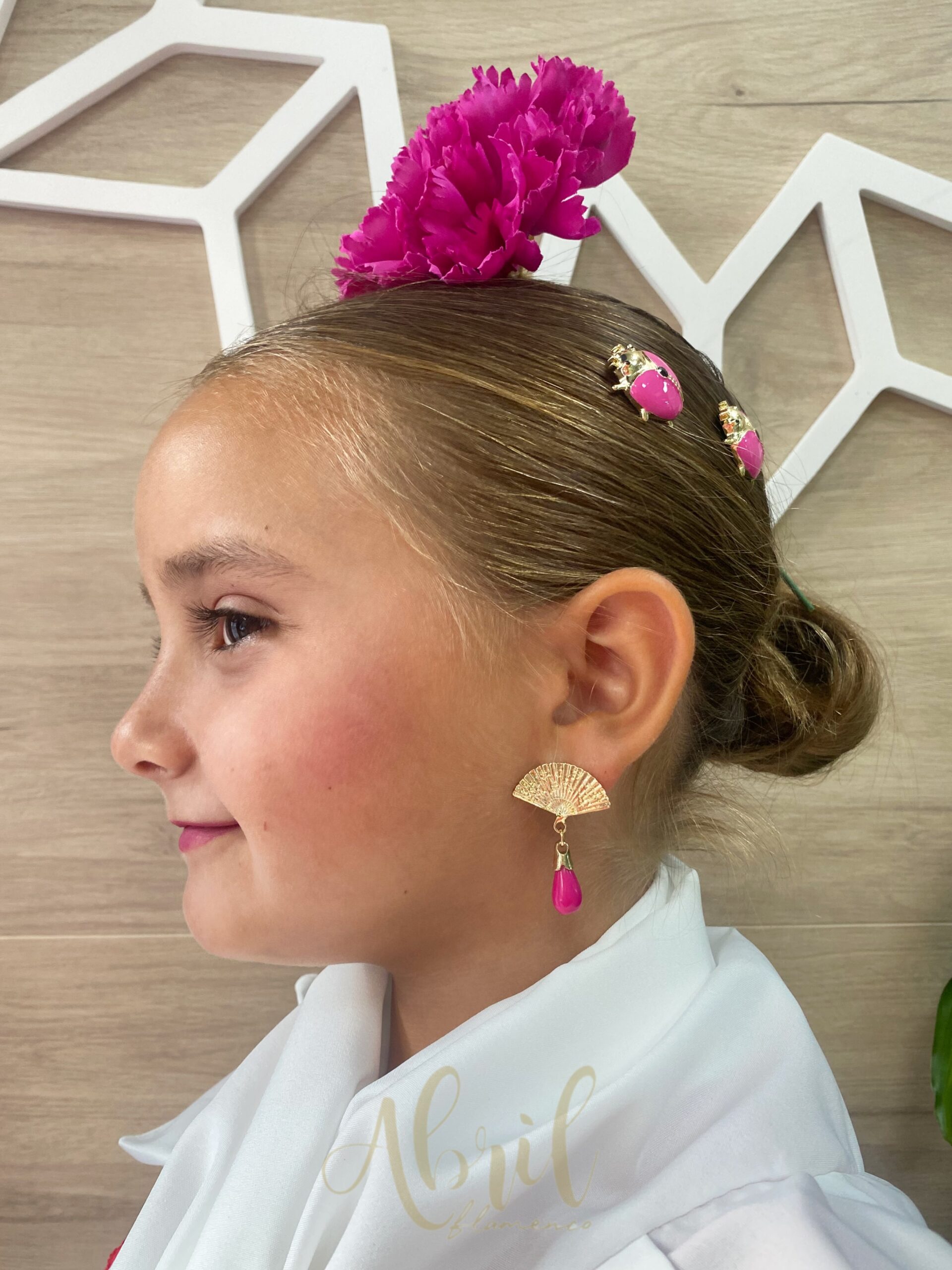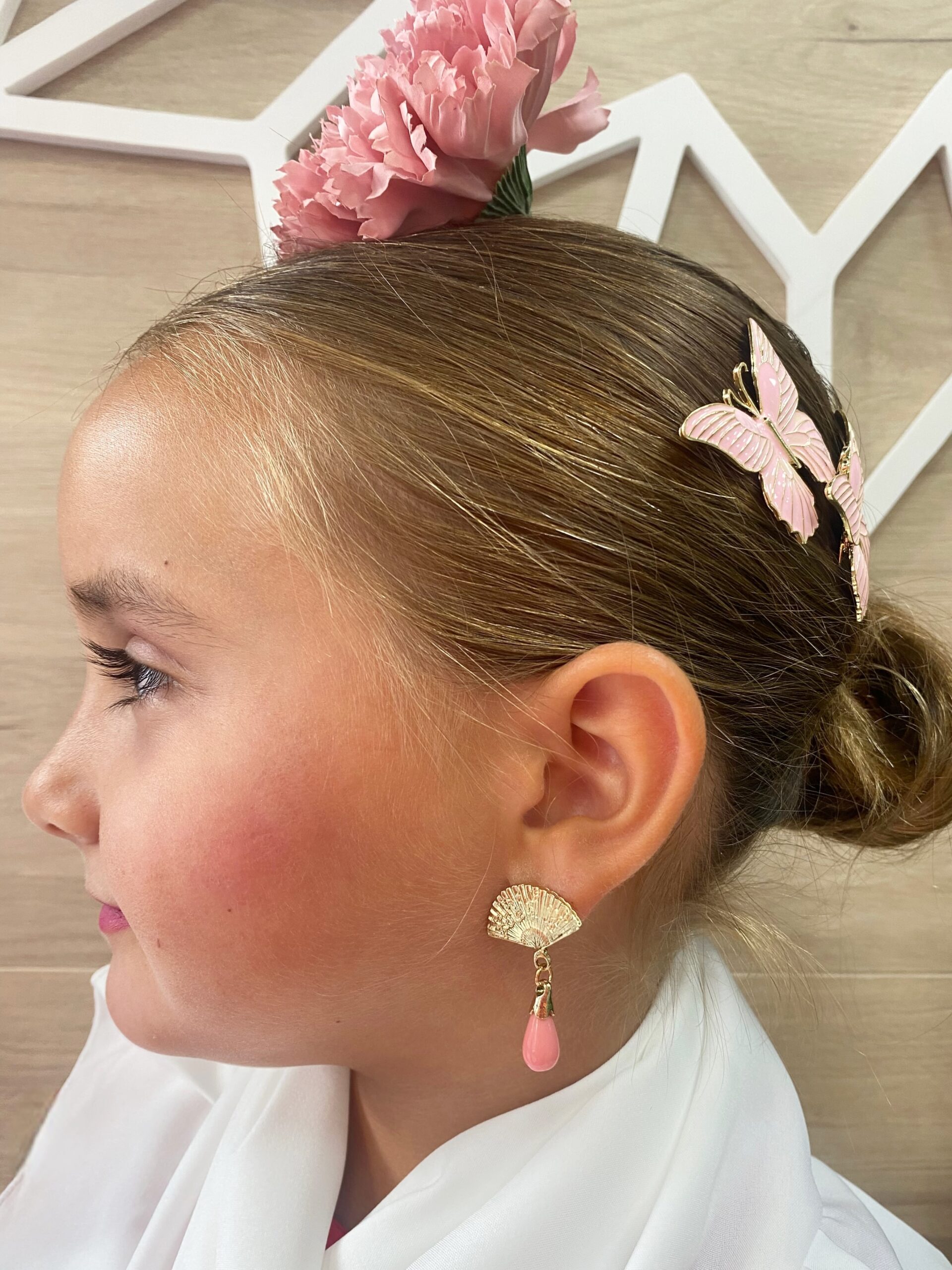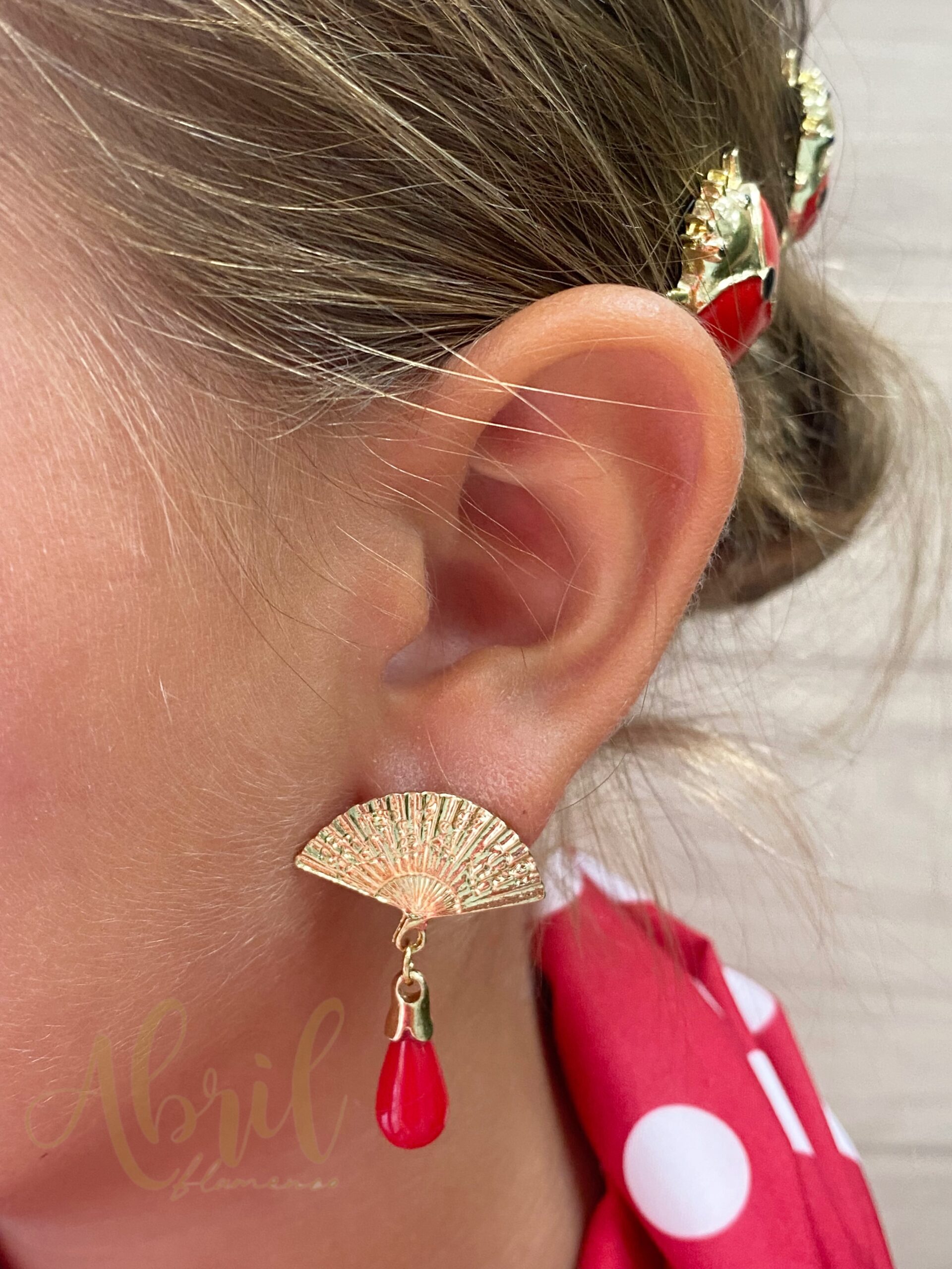 Pendientes infantiles de abanico dorado con pequeña lágrima en color.