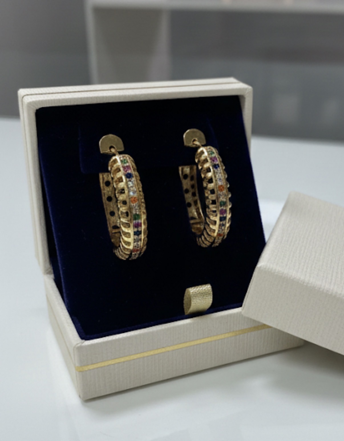 Pendientes aros en golfi, dorados y con cristalillos de colores.