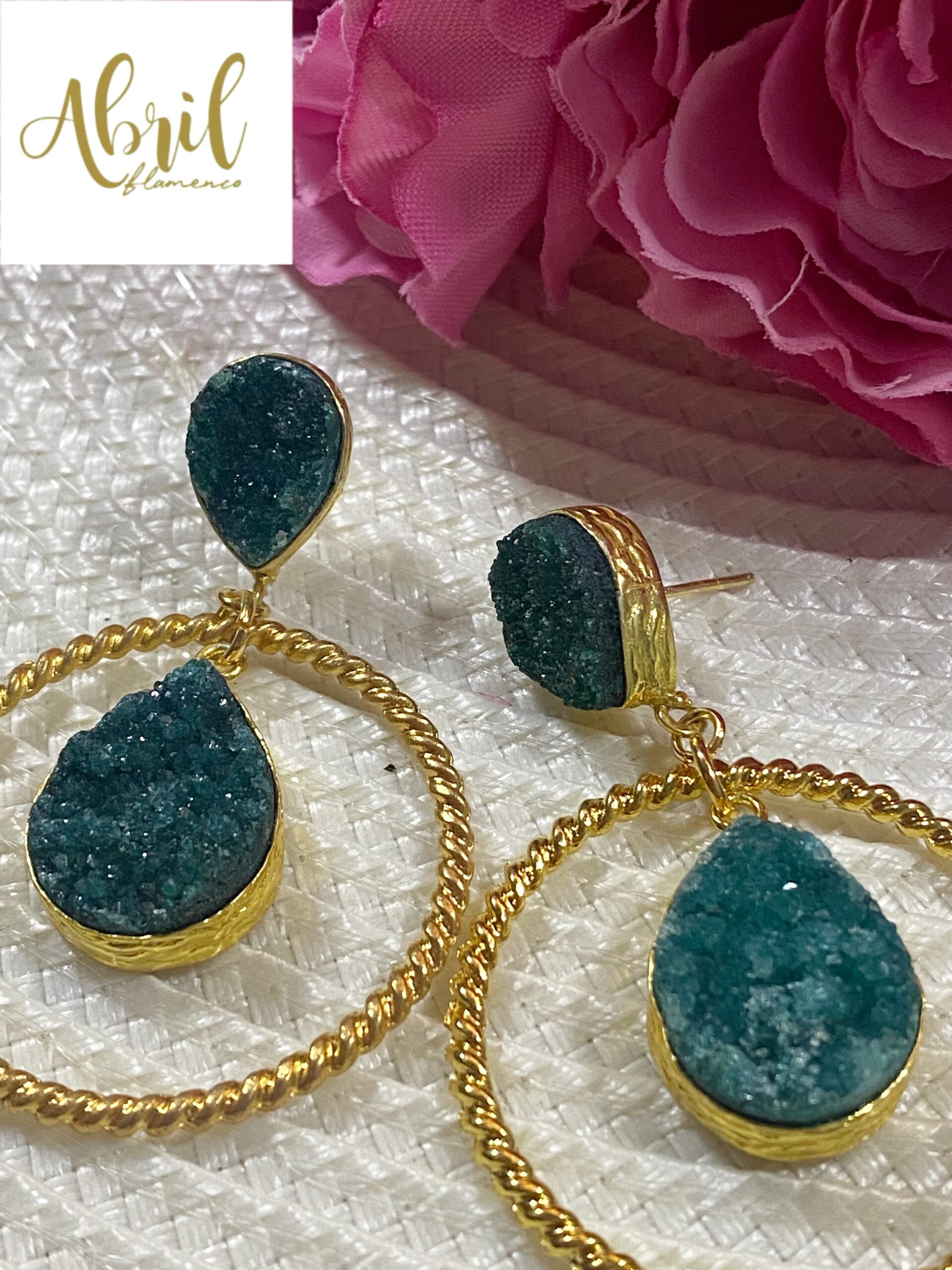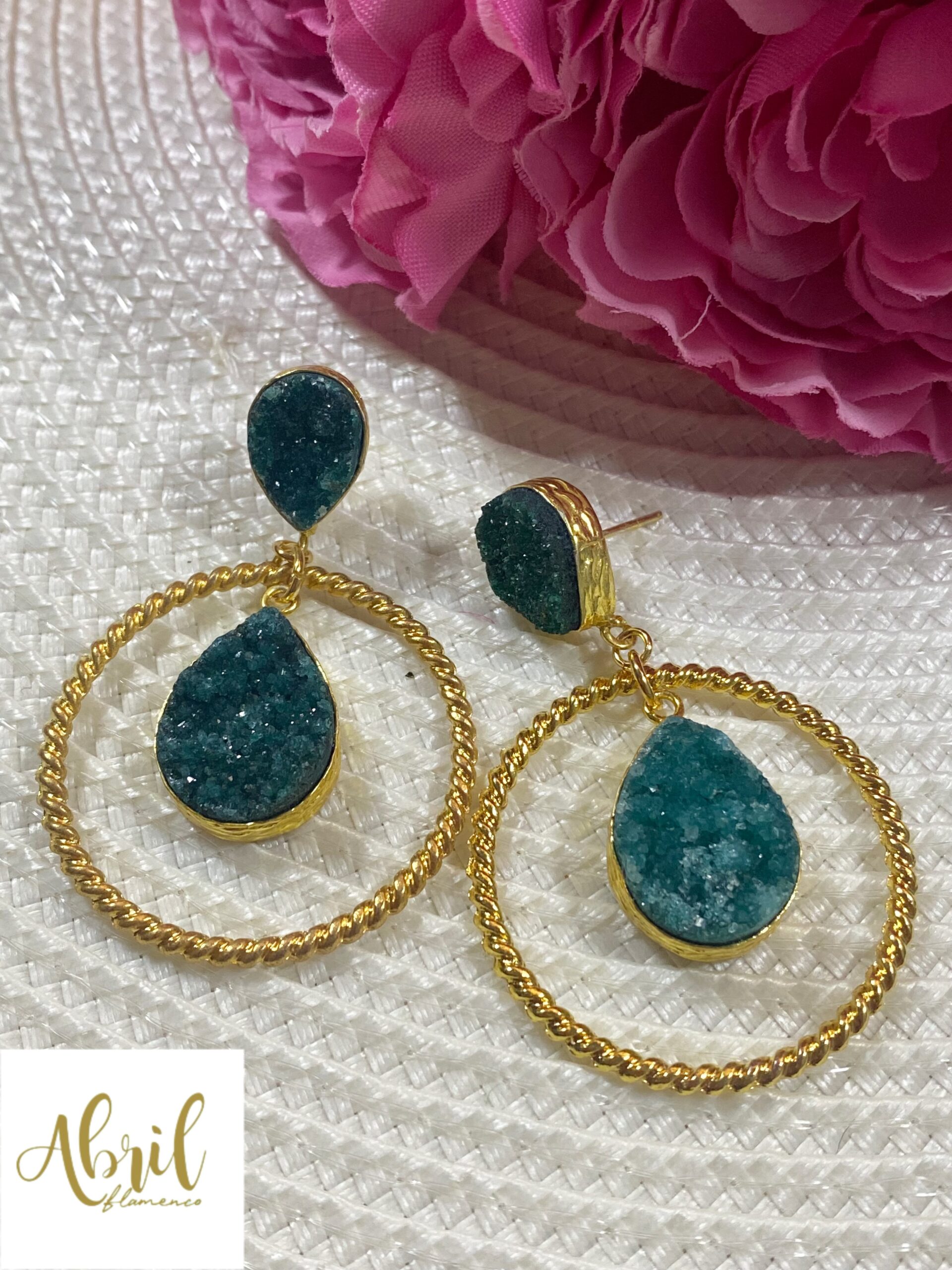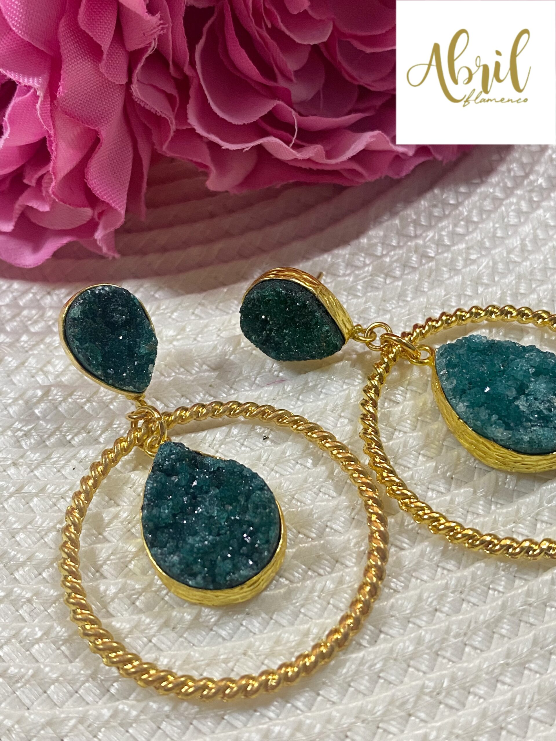 Pendientes aros con piedra perforada verde