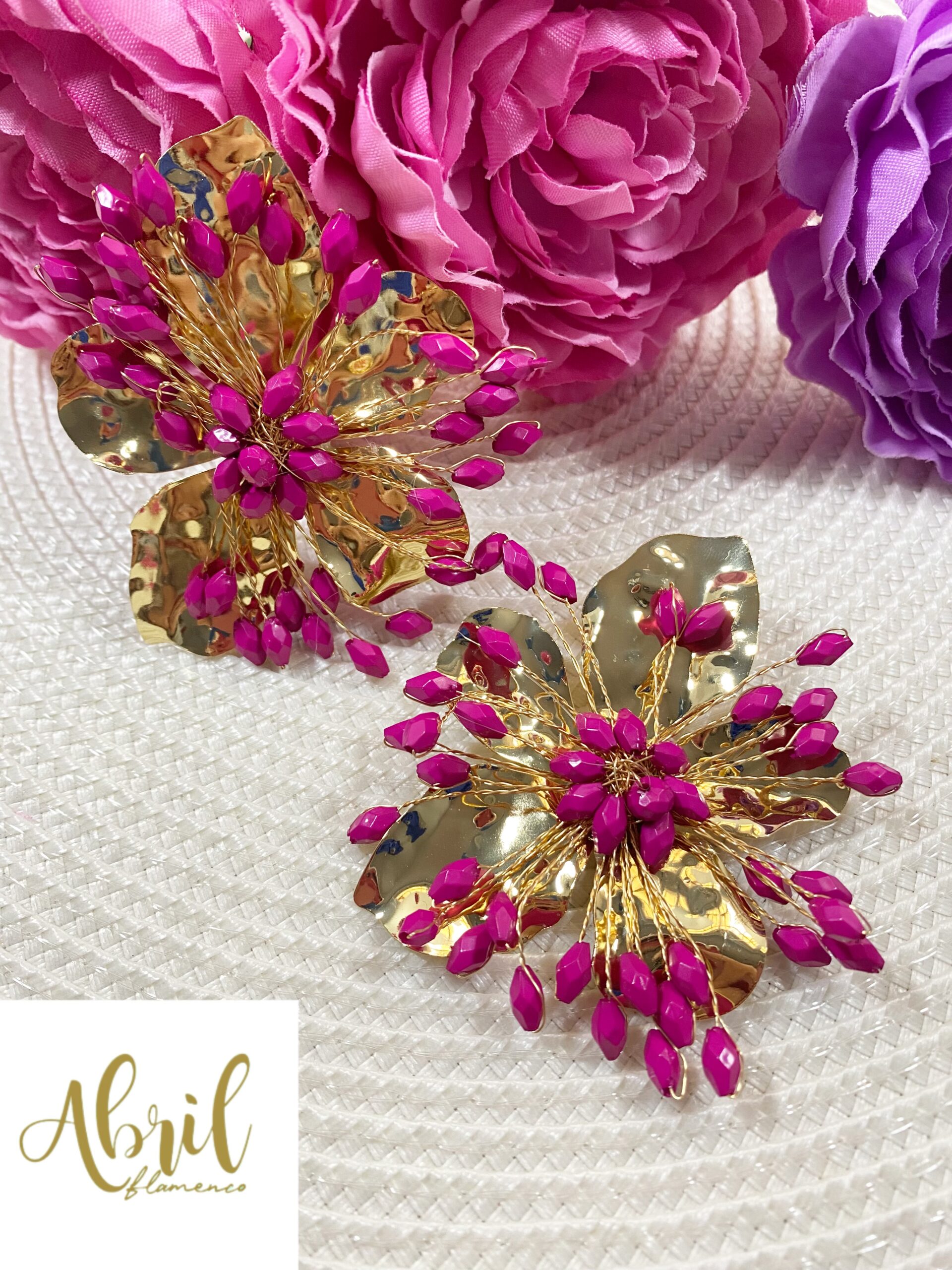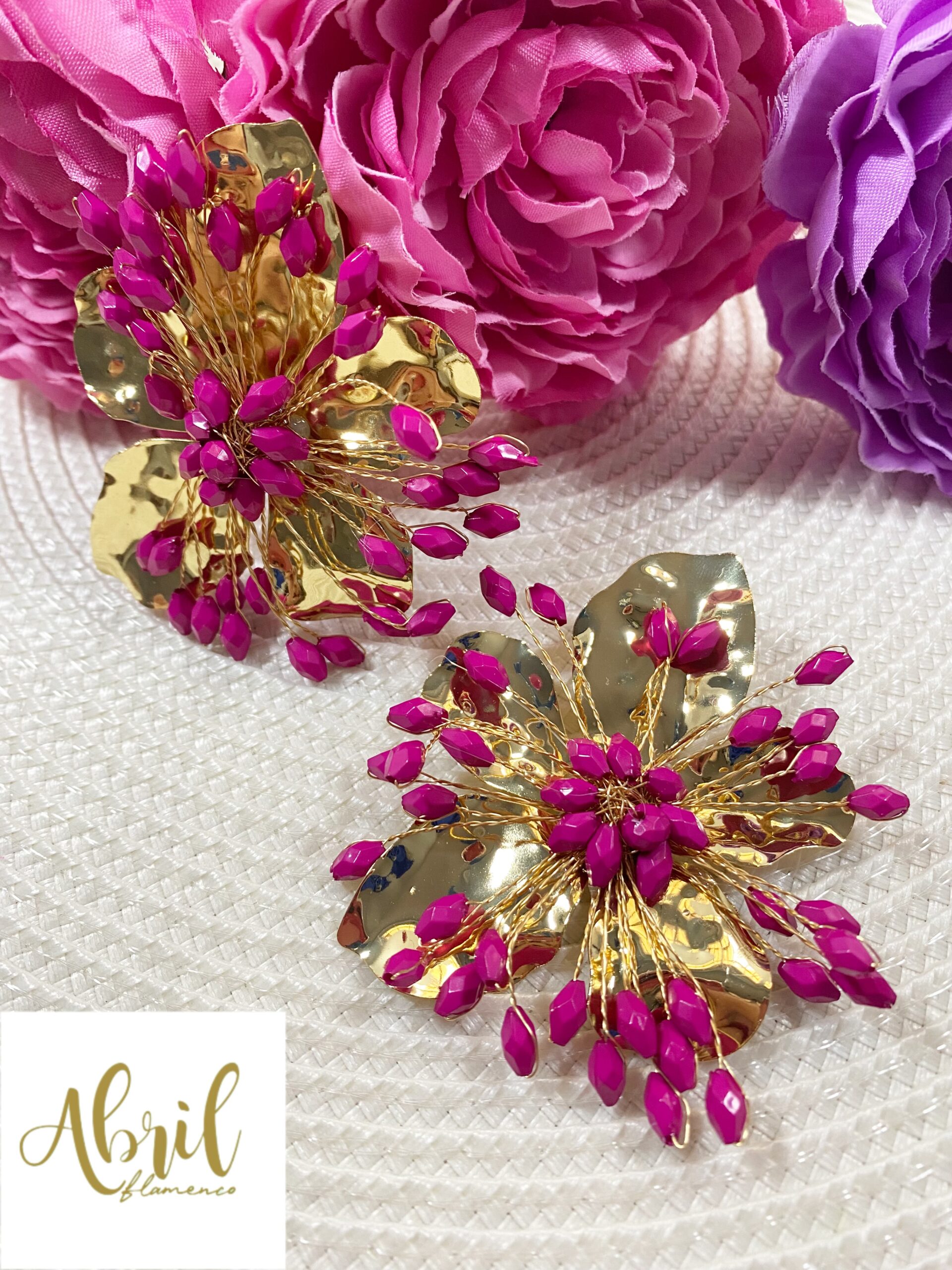 Pendientes flor dorada grande con aplicaciones verde fucsia.