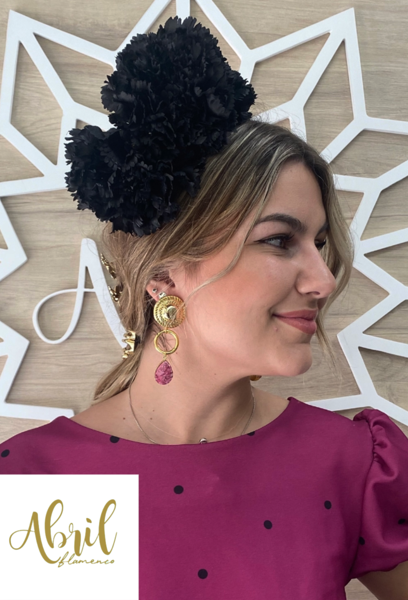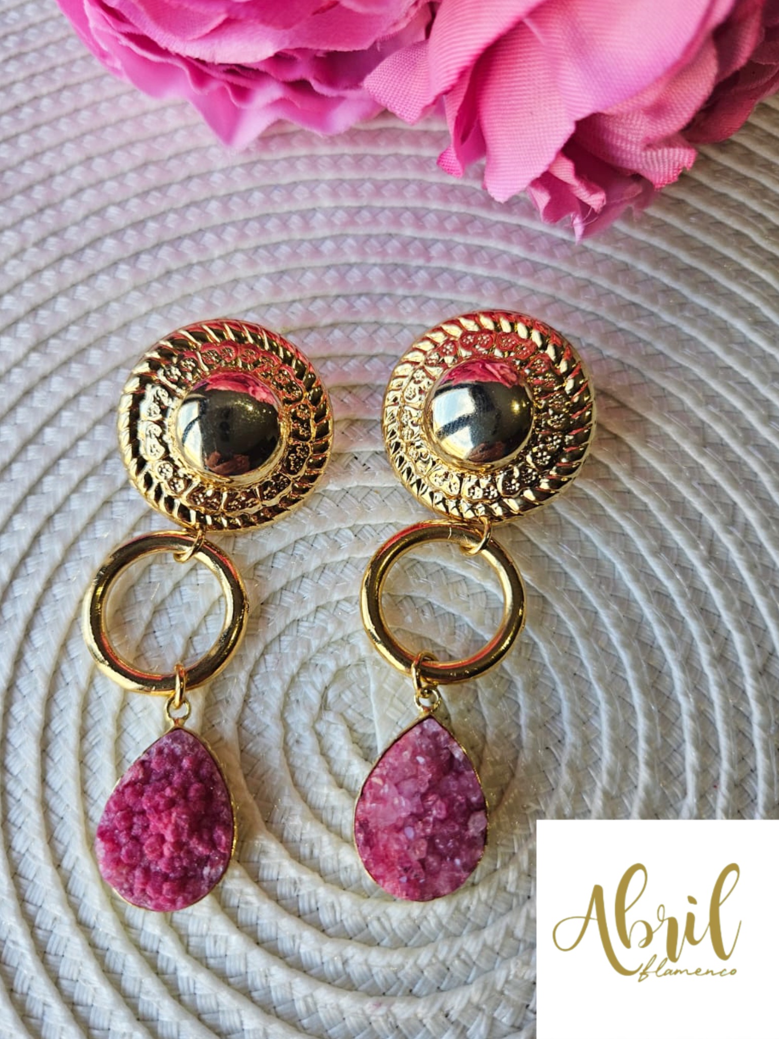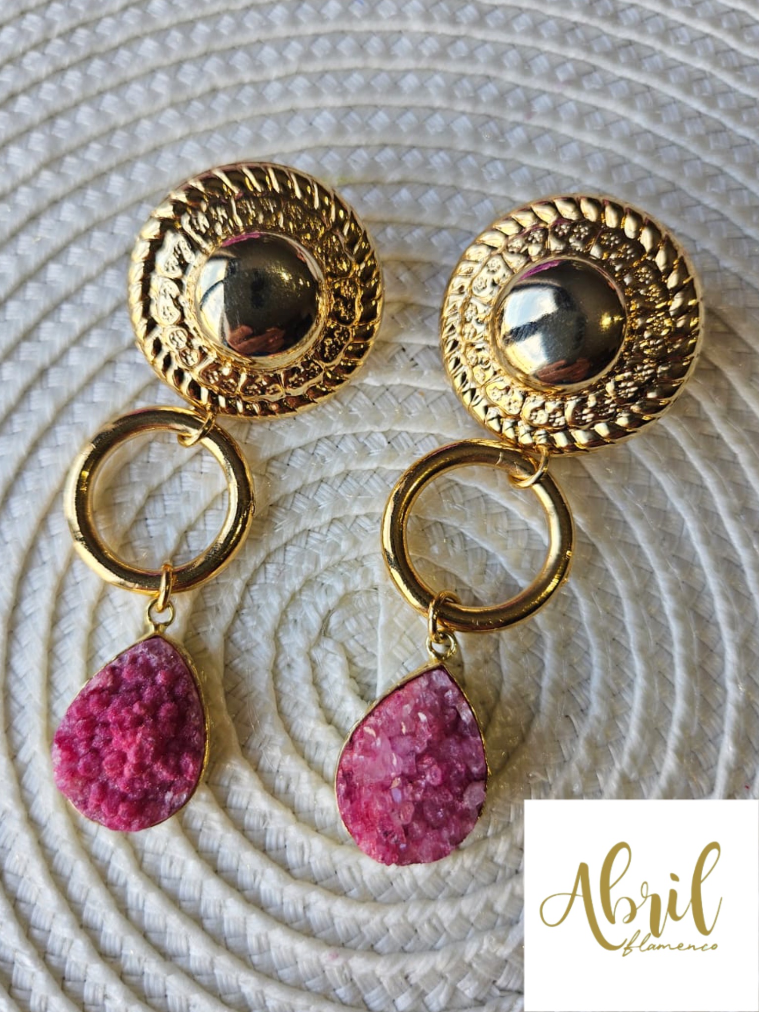 Pendientes largos dorados con piedra perforada en color rosa/buganvilla.