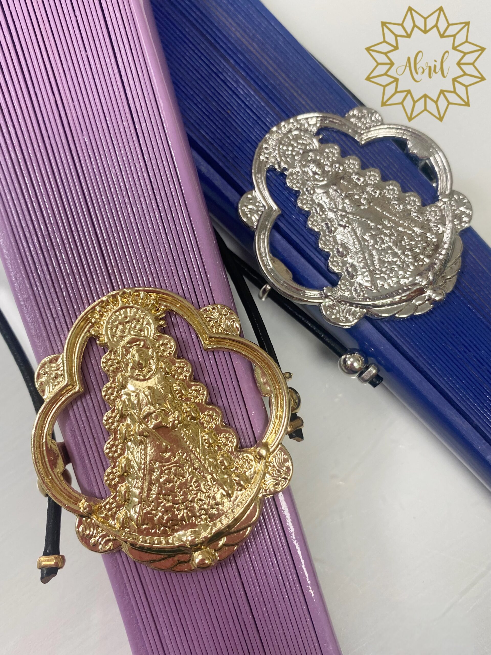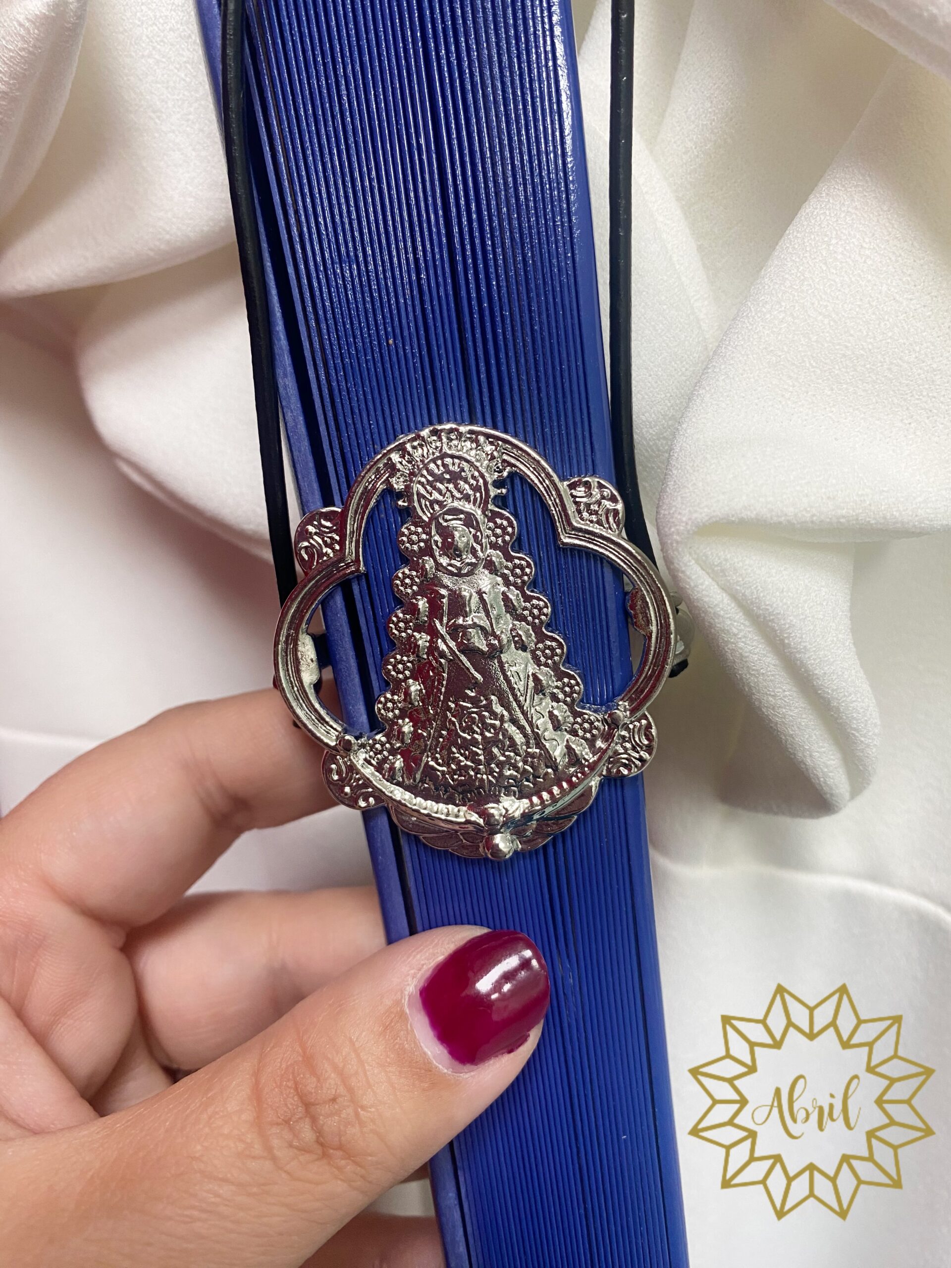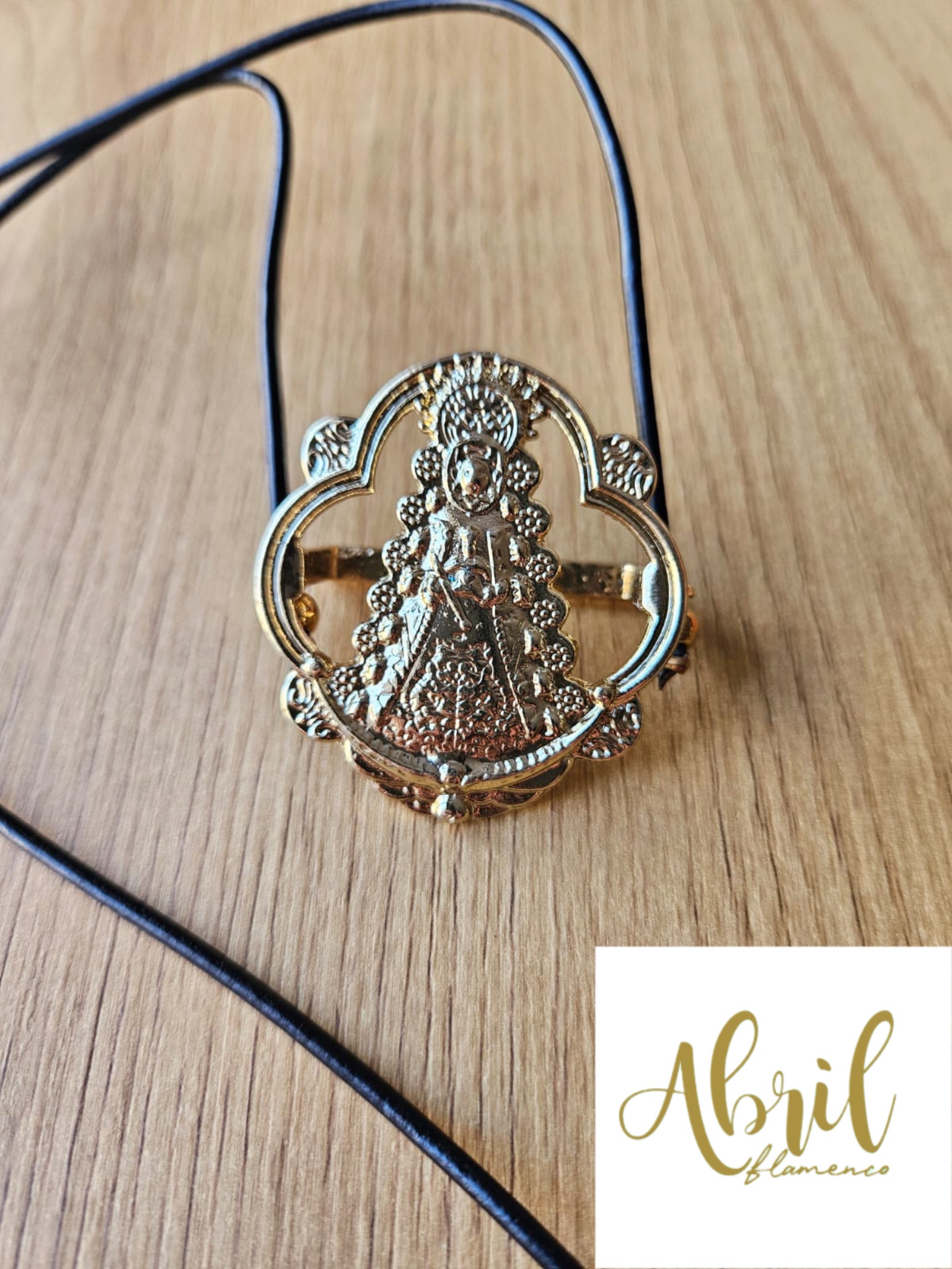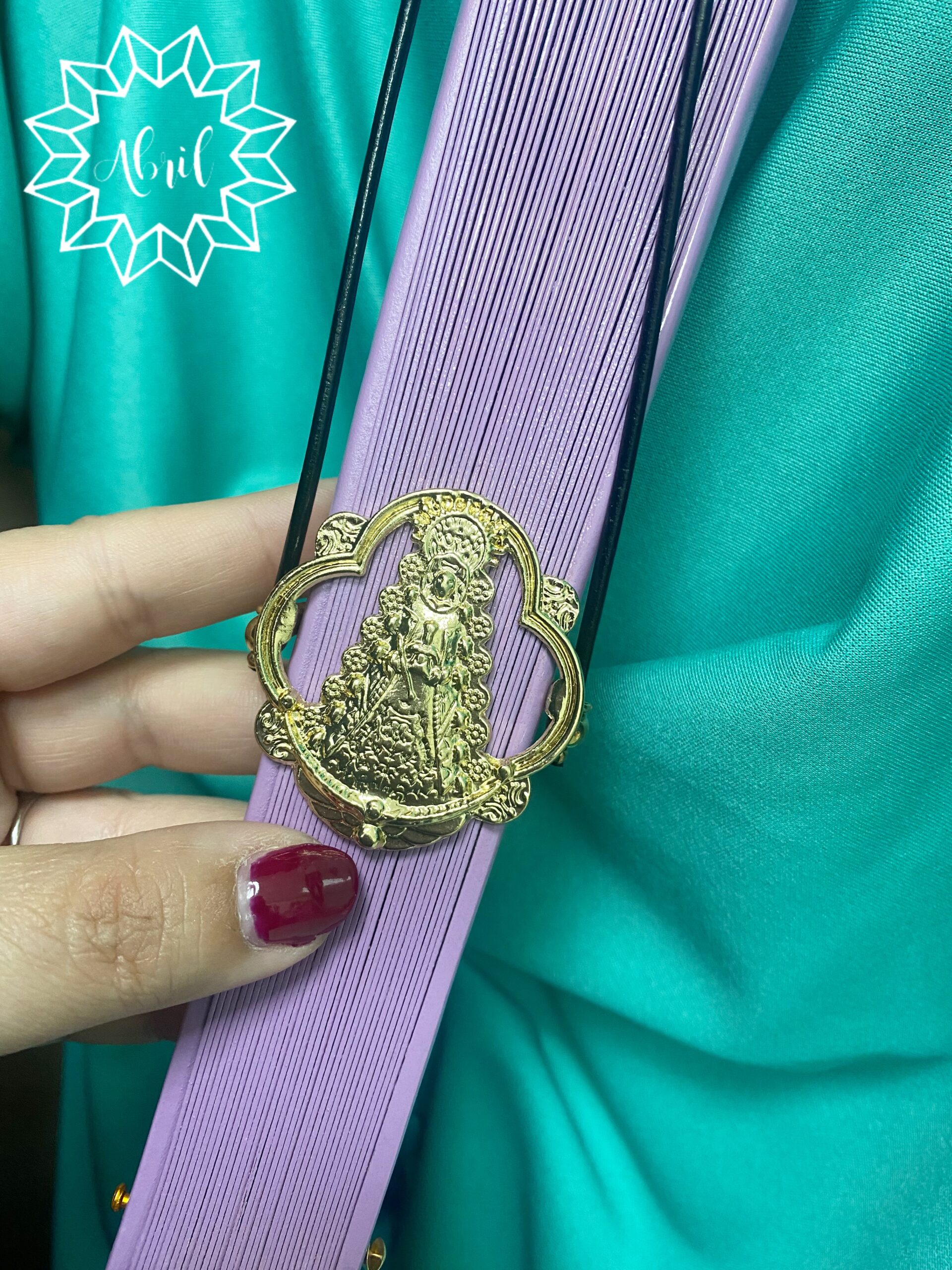 Porta abanico de la Virgen del Rocío en dorado.