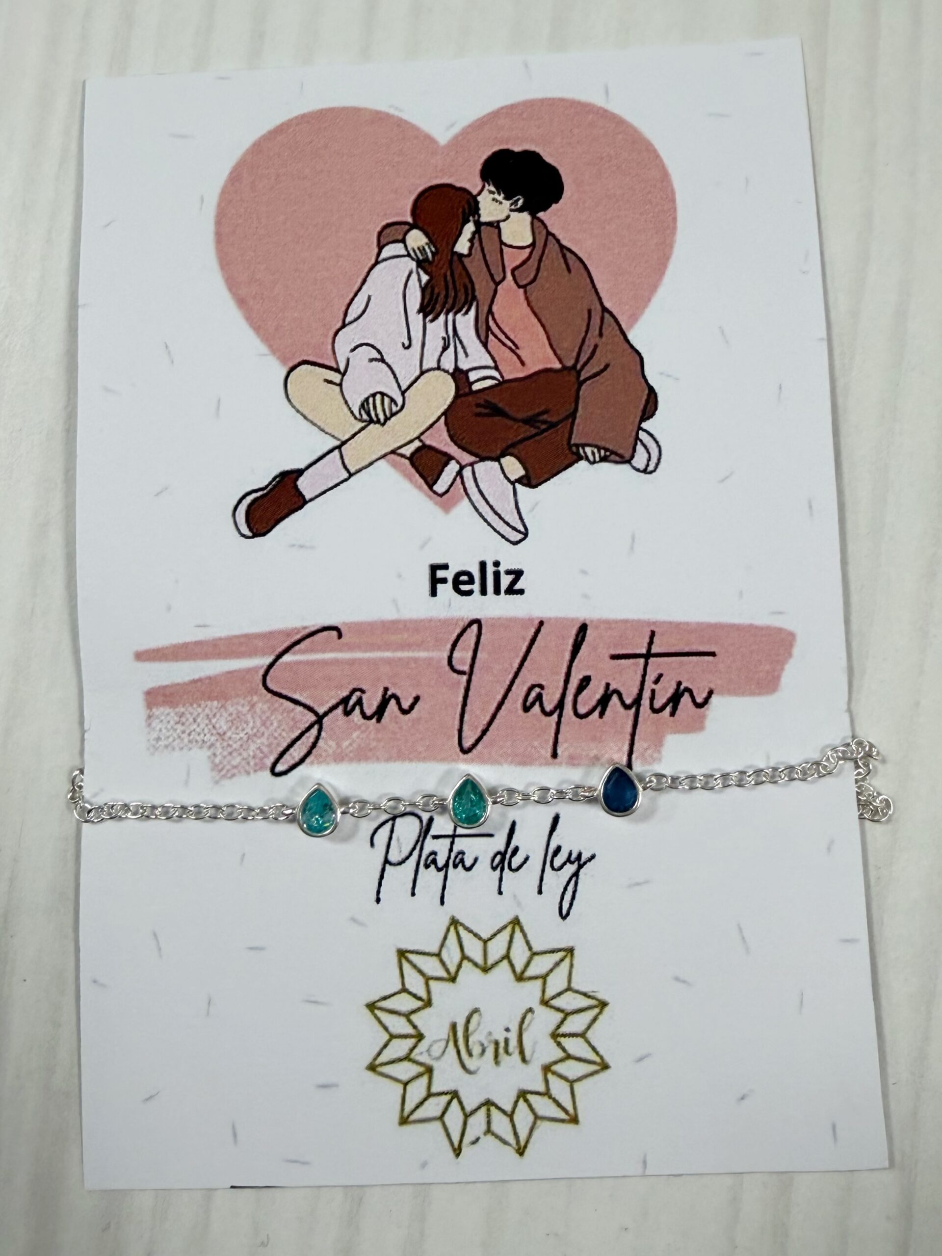 Pulsera en plata de ley de 3 gotas de agua en cristal azules.