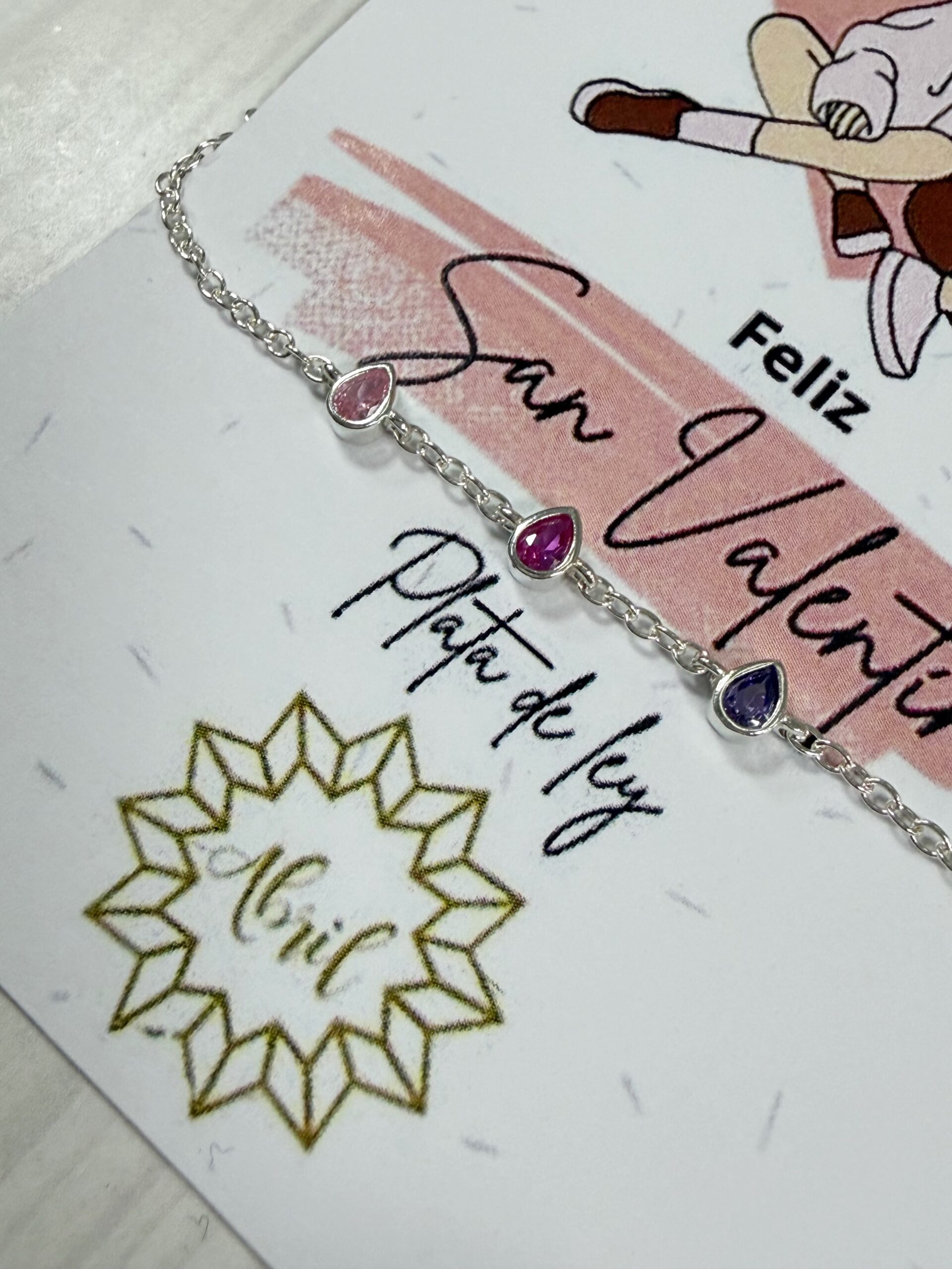 Pulsera en plata d ele y de 3 gotas de agua en cristal rosa.