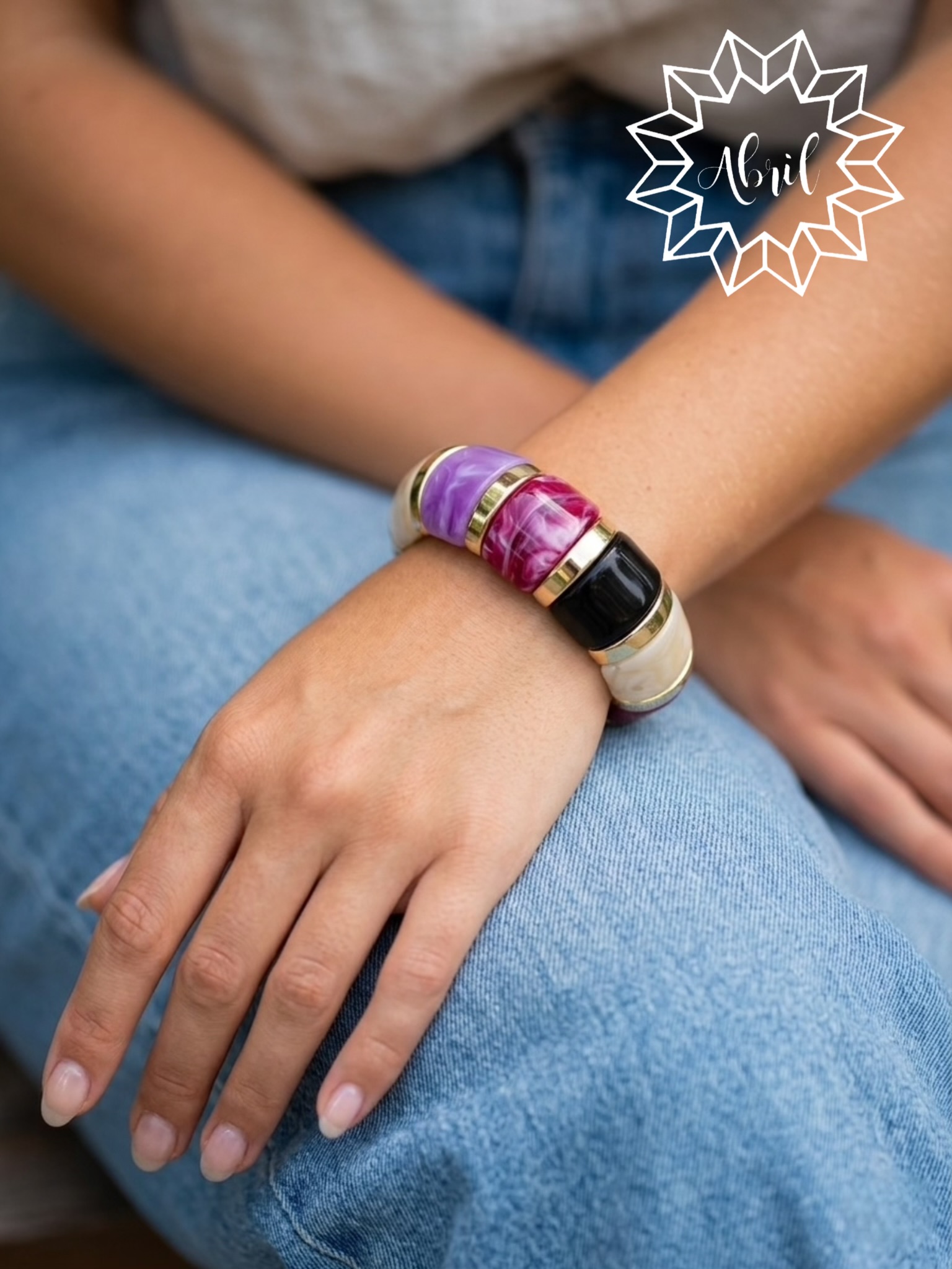 Pulsera elástica, colorida y con detalles dorados.