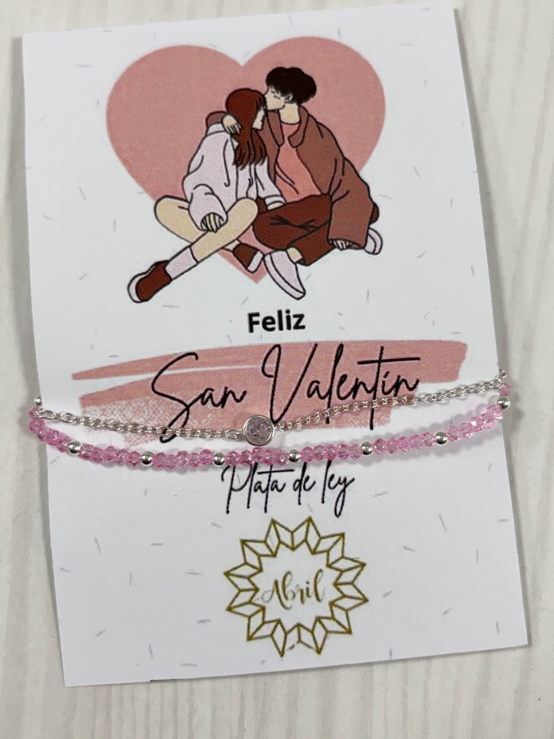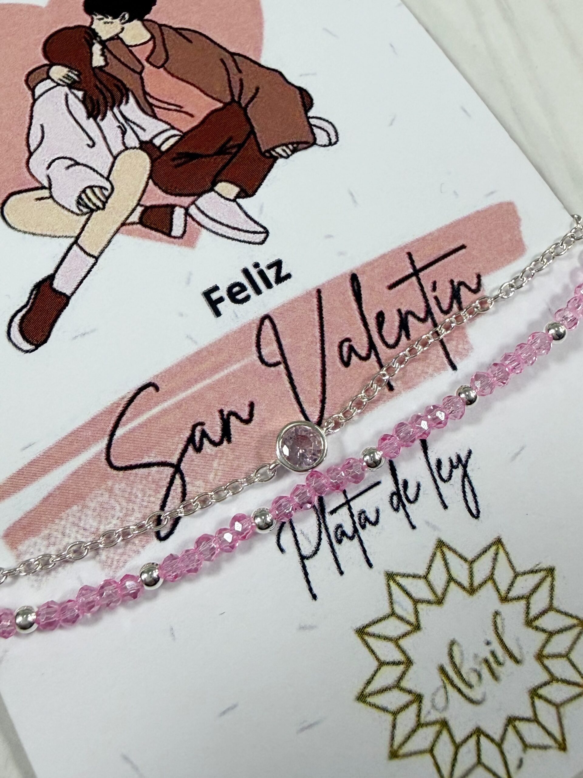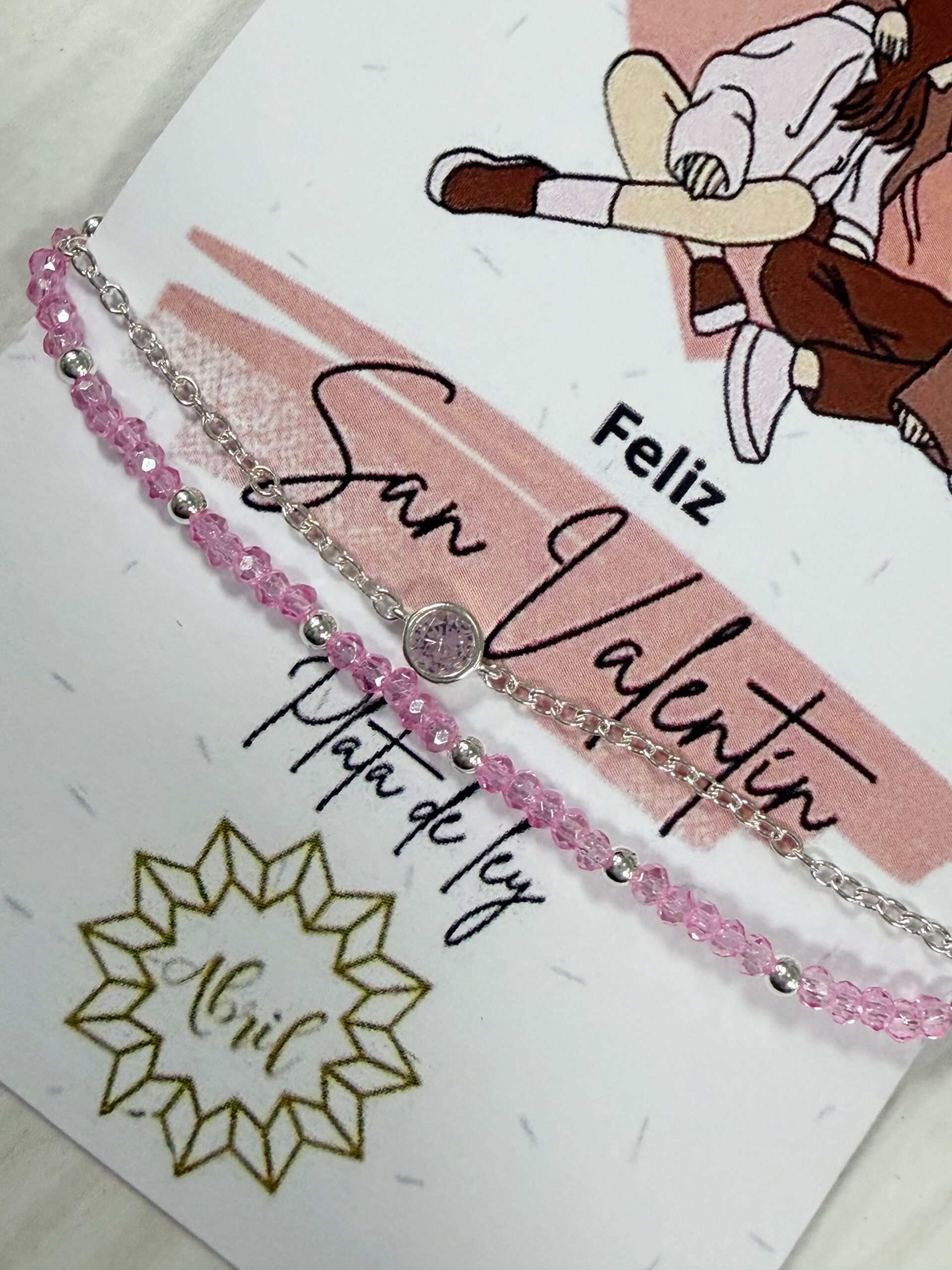 Pulsera en plata de ley, doble en rosa con cristal pequeño en rosa.