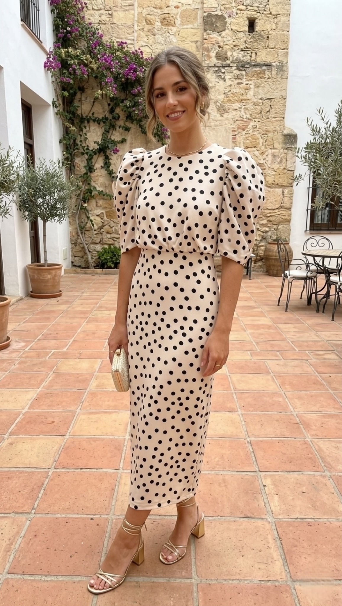 Vestido blanco y lunar negro, elástico y mangas abullonadas.