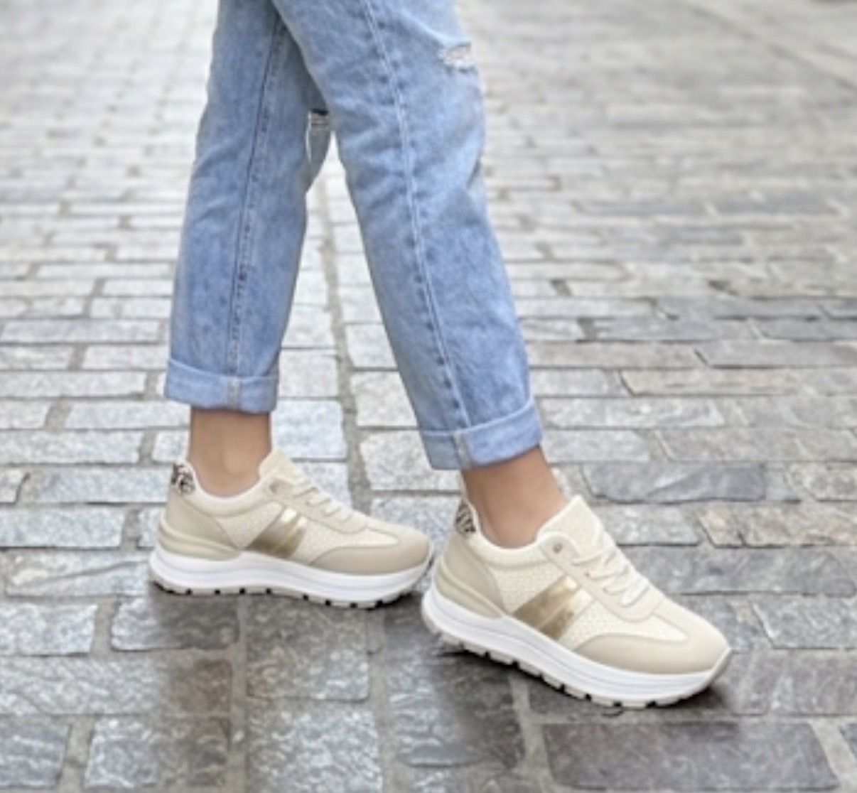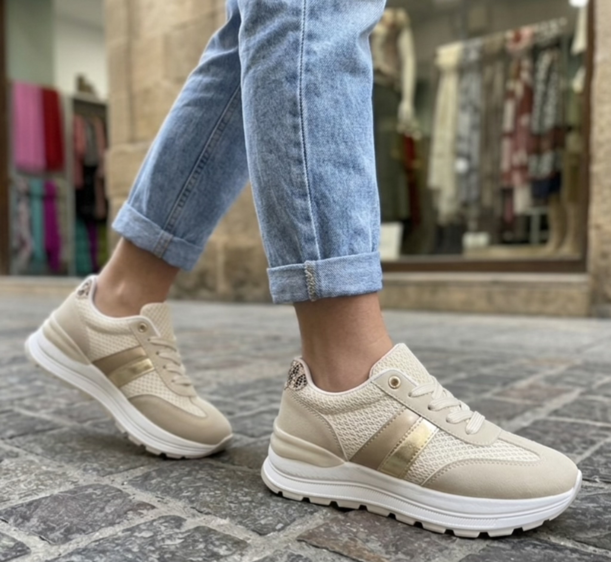 Zapatillas en colores neutros, blanco, beige y dorado.